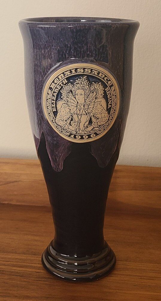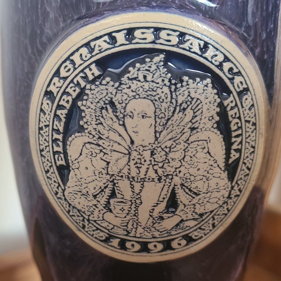 Renaissance fair Queen Elizabeth pottery goblet. Purple and cream colors dated 1996
