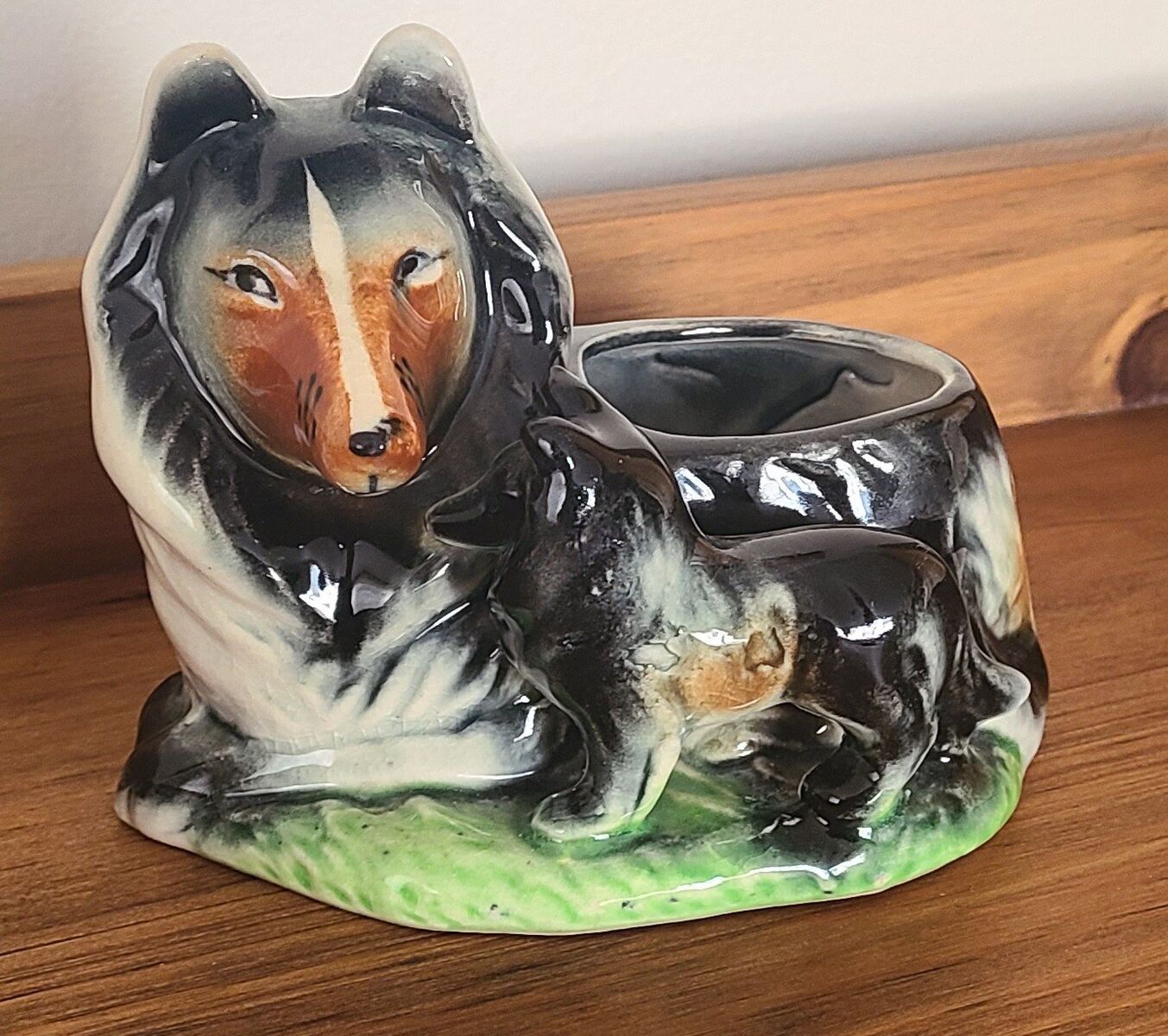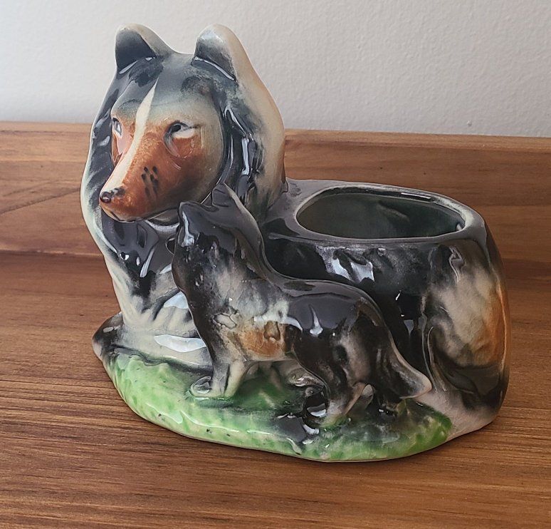 Little collie dog with puppy planter. Vintage