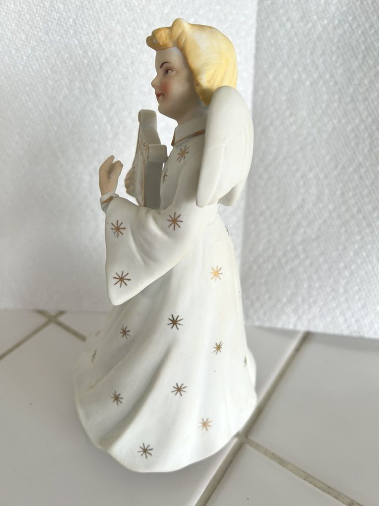 This particular angel, with its harp and star motif, aligns with the aesthetic trends of the 1950s. Such figurines were commonly produced in bisque porcelain, which gives them a matte, unglazed finish that enhances their delicate appearance. They were often sold individually or in sets, becoming cherished heirlooms and decorative accents in many households.