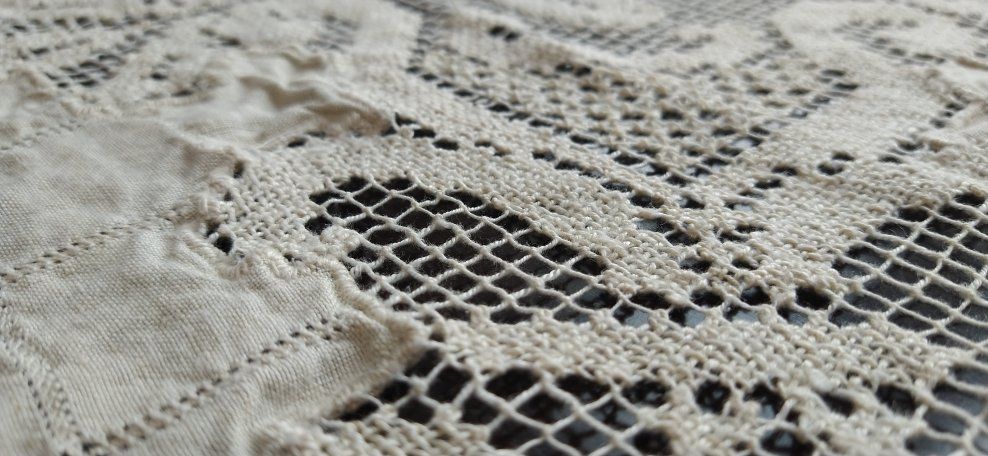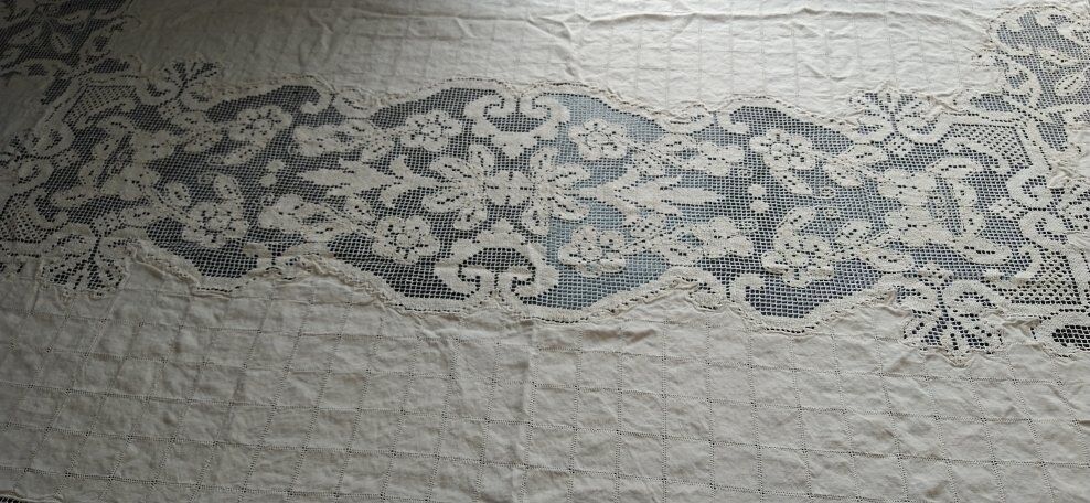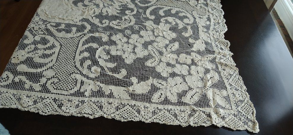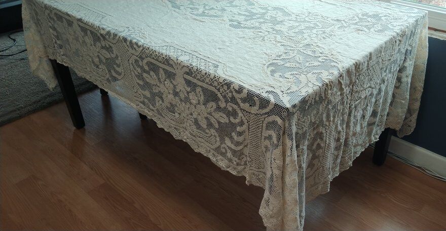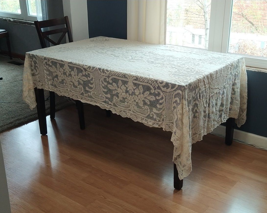 Cream colored 62 x 90 inches tablecloth. It was my aunt's tablecloth. Very unique and pretty.