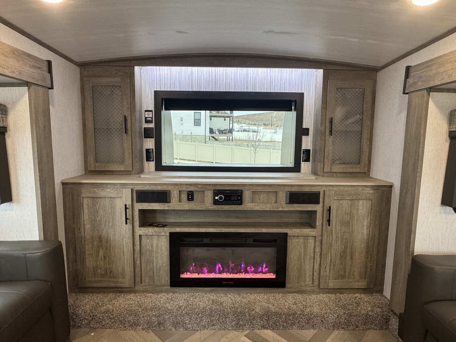 The front living room features opposing slides, theater seating, and a TV that raises and lowers from the entertainment center. The sofas convert into beds for additional sleeping space, making it great for guests.
