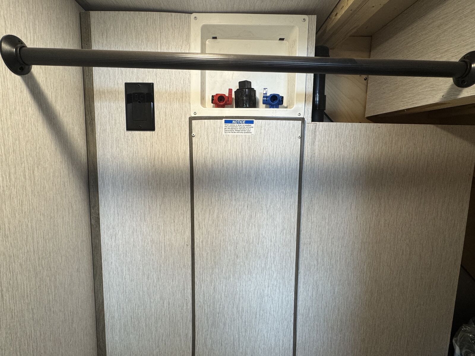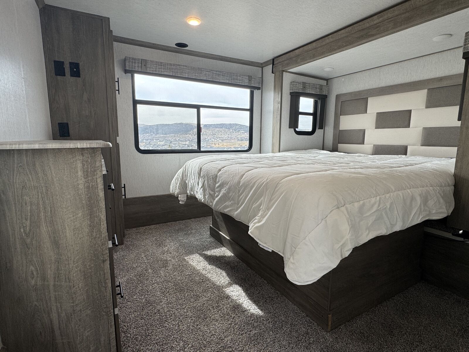 The primary bedroom includes an RV king bed, built-in dresser, large closet, and washer/dryer hookups.