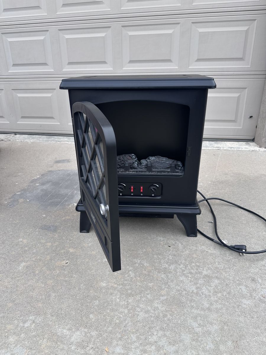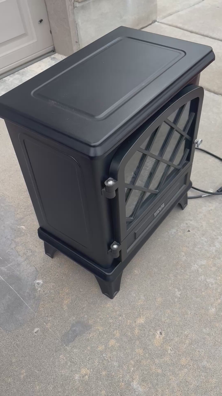 Venmoduraflame Freestanding Electric Fireplace Stove Heater with 3D Flame Effect for 1,000 Sq. Ft. Room, Black: Includes side viewing windows, a glass door that really opens, and a brick-style back panel. Delivers infrared heat in any room up to 1,000 square feet. Easily carry this portable heater to any room you wish.