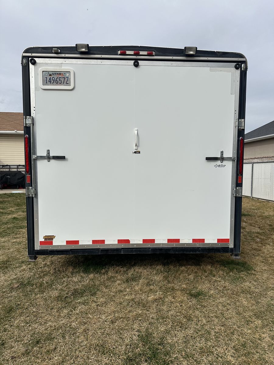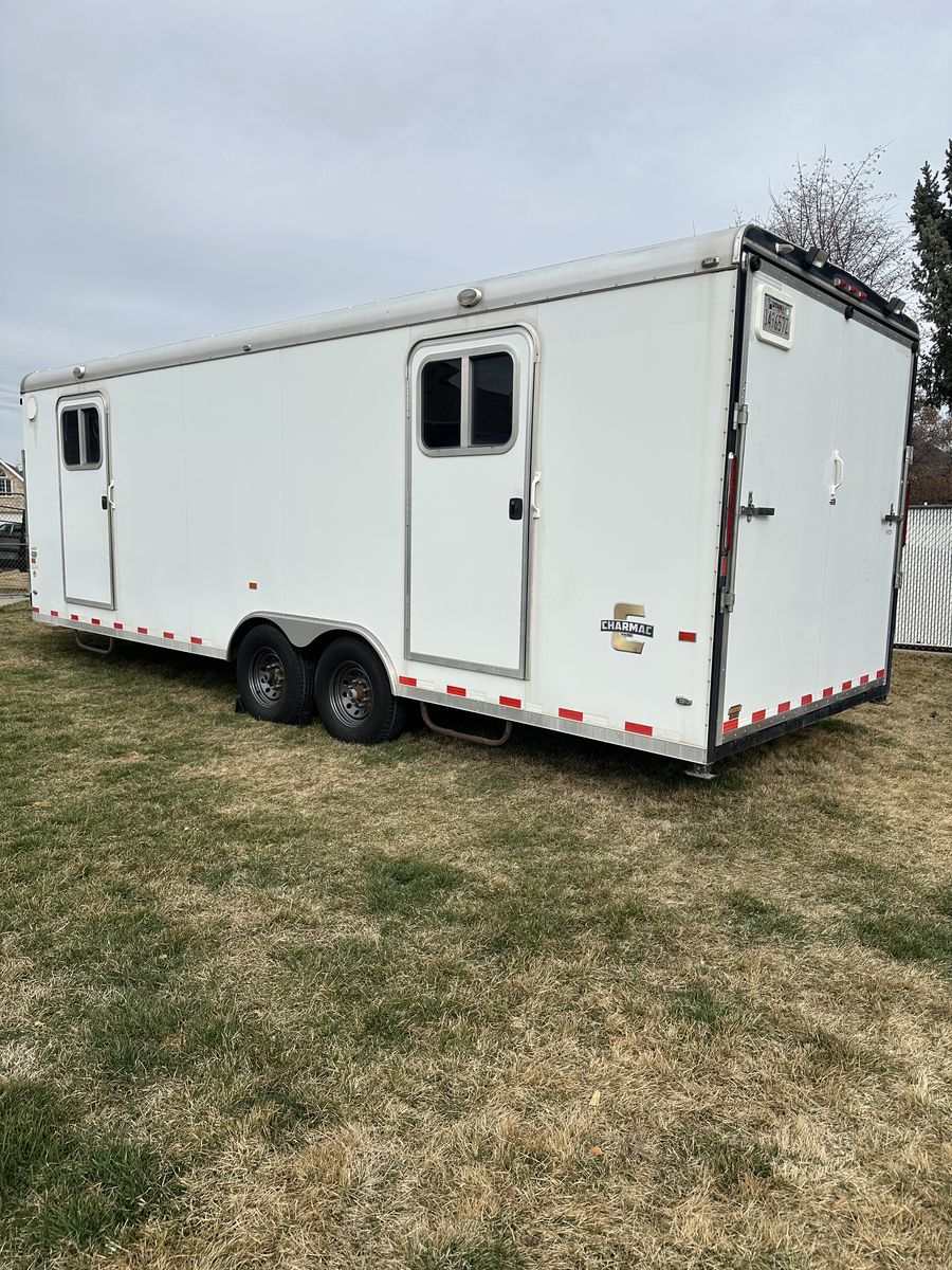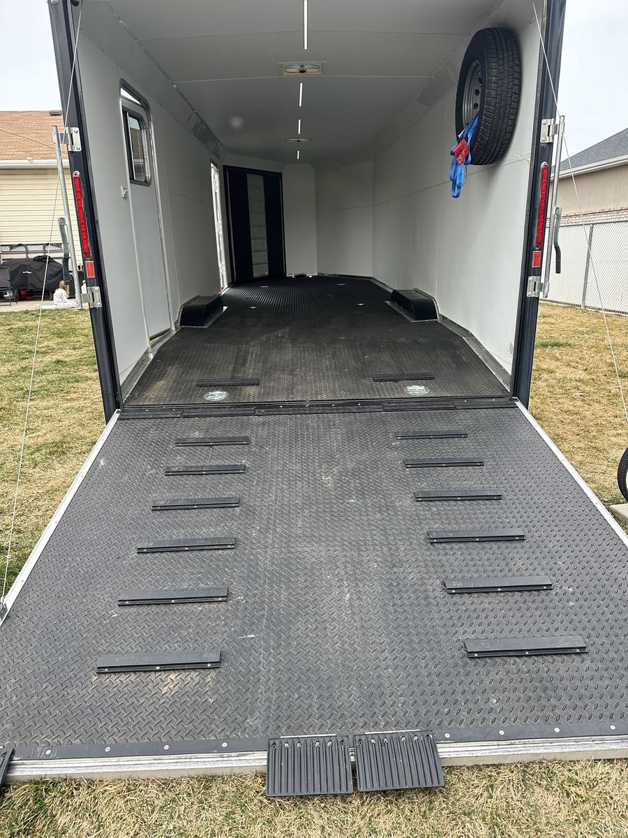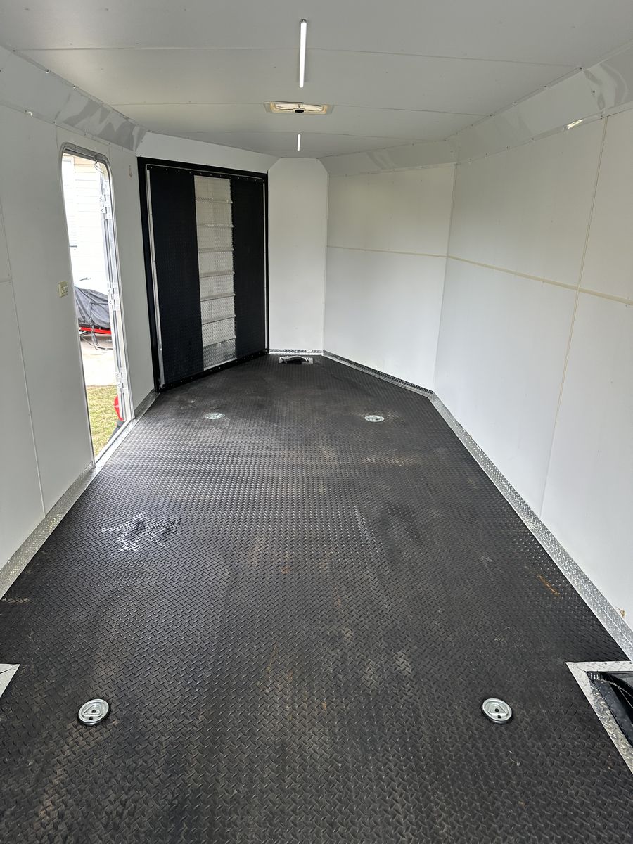 VenmoAwesome multi use enclosed trailer. It has been used for snowmobiles, utvs, atvs, off-road vehicles and a race car. The roof was freshly resealed along with new roof vents. Wheels were just repainted. Axle bearings freshly repacked. New rear led lights. New tongue jack with cover and remote. Brand new battery inside and for trailer brake box. I have had 7 older snowmobiles in it but comfortably fit 6 snowmobiles most of the time. It's overall in great shape, obviously not going to be perfect. A couple blemishes here and there. 6,000lb flush tie downs in floor. 6,000lb torsion axles. 6,000lb load capacity. Front and rear flood lighting. Snowmobile track grabbers on ramps. Rubber diamond flooring. Spare tire carrier and spare straps included. Rear load drop down jacks. Title in hand, NO TRADES! Interior dimensions: 7ft tall ceiling, 8ft 3 inches wide from wall to wall, 6ft long nose up front, 23ft 6 inches length rectangle from end of vnose length. Overall 30ft interior length.