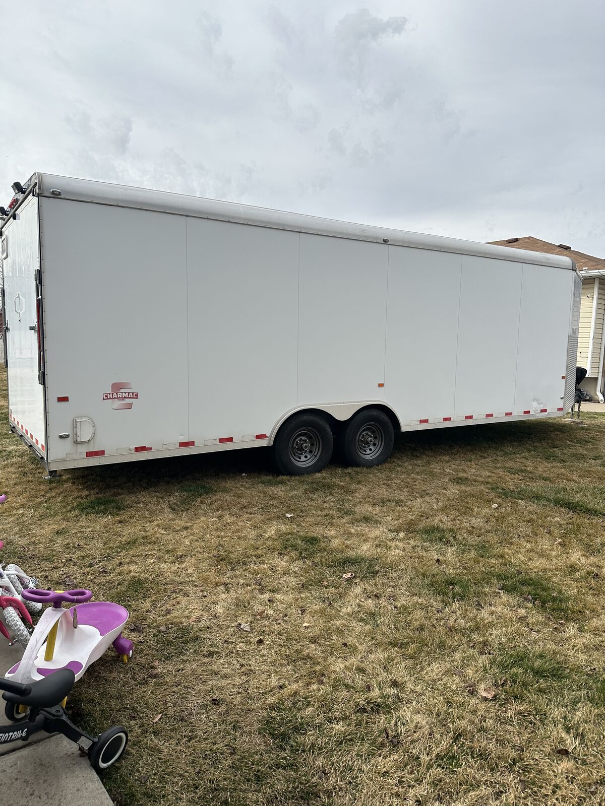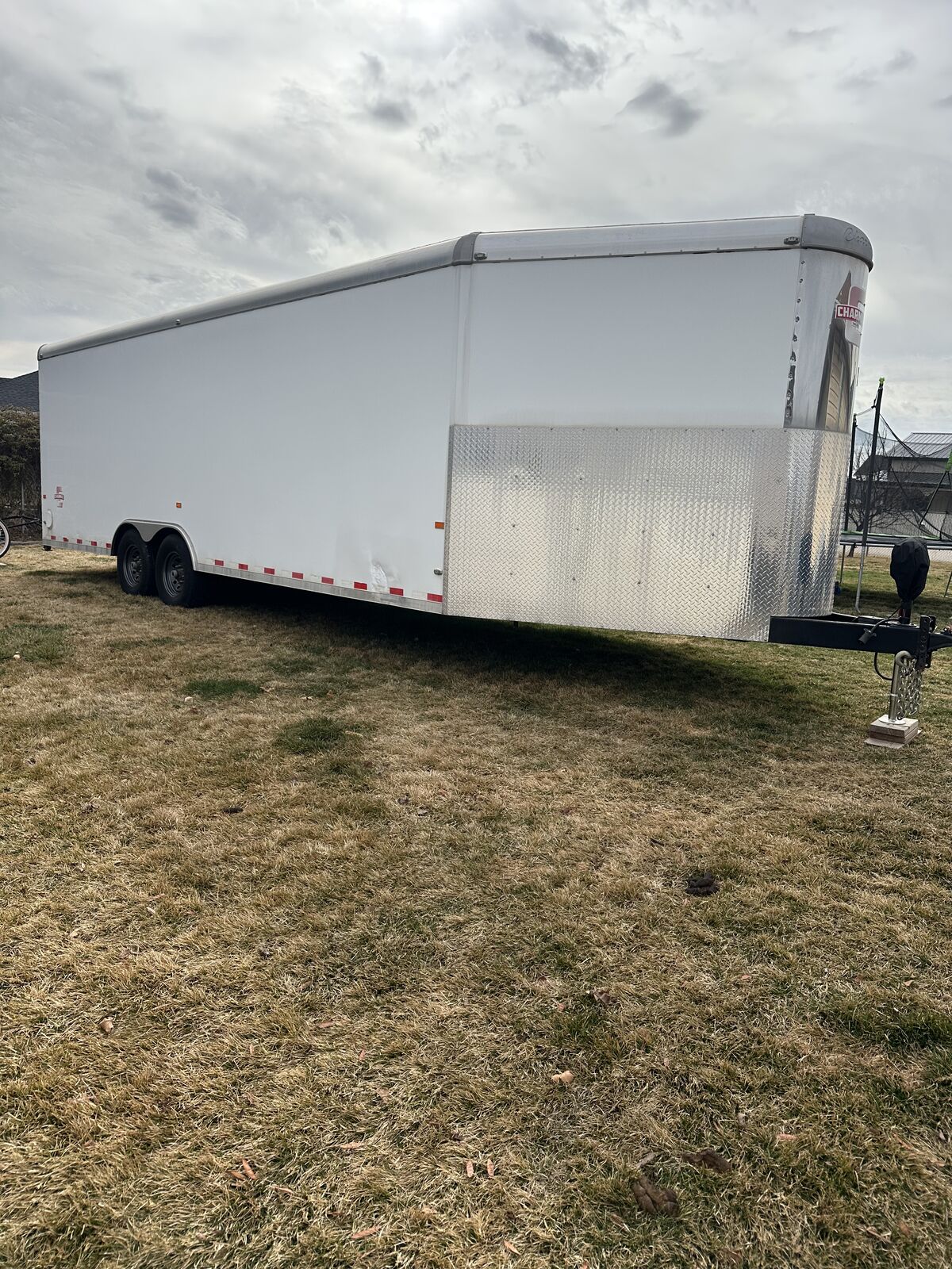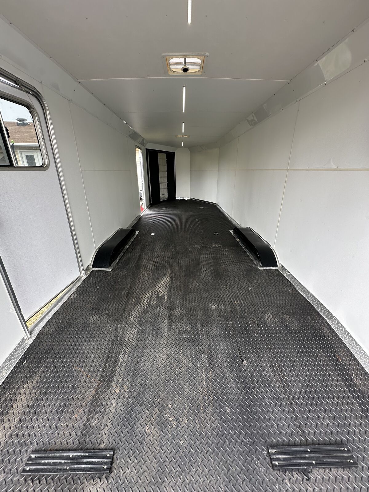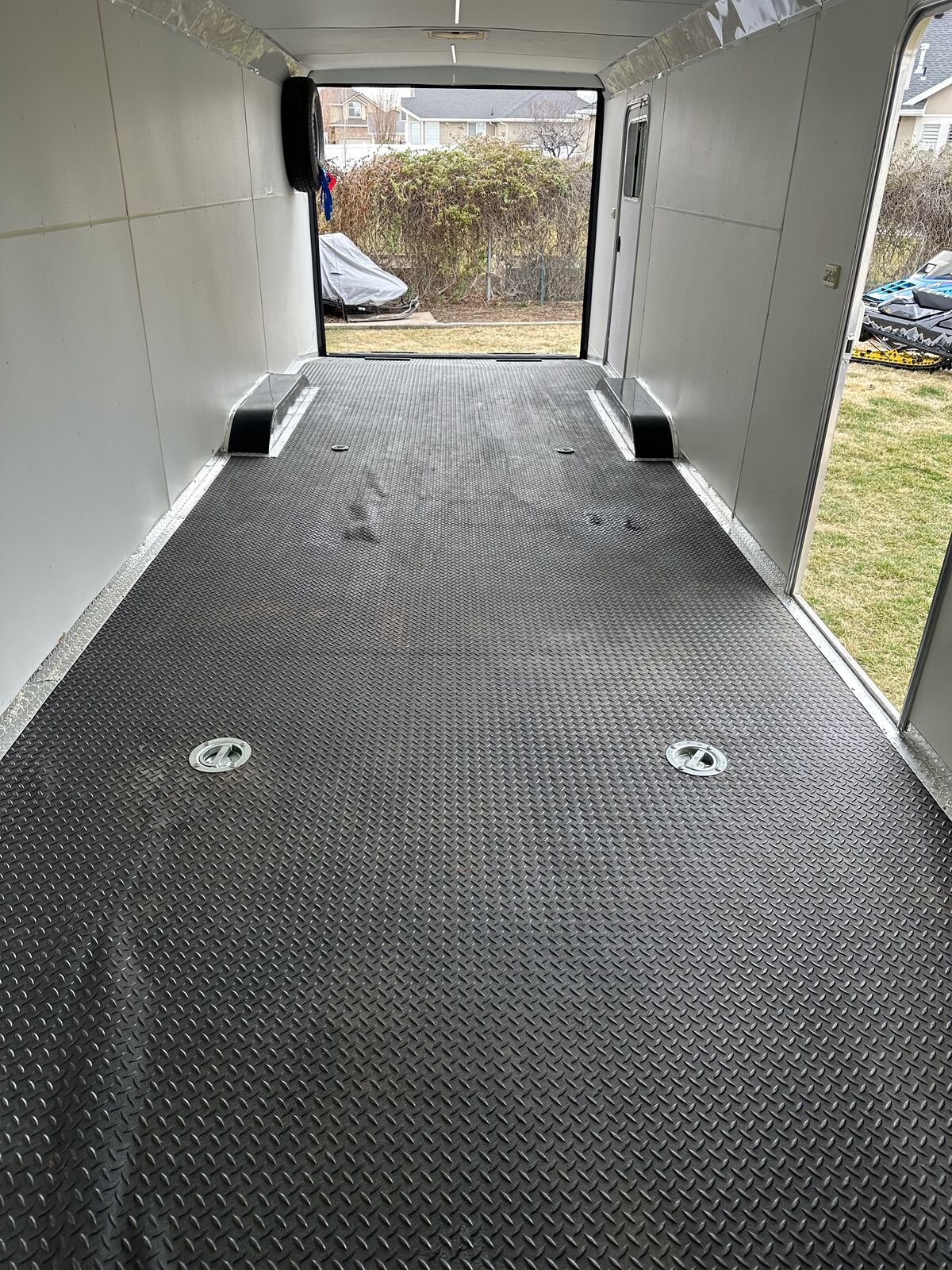 VenmoAwesome multi use enclosed trailer. It has been used for snowmobiles, utvs, atvs, off-road vehicles and a race car. The roof was freshly resealed along with new roof vents. Wheels were just repainted. Axle bearings freshly repacked. New rear led lights. New tongue jack with cover and remote. Brand new battery inside and for trailer brake box. I have had 7 older snowmobiles in it but comfortably fit 6 snowmobiles most of the time. It's overall in great shape, obviously not going to be perfect. A couple blemishes here and there. 6,000lb flush tie downs in floor. 6,000lb torsion axles. 6,000lb load capacity. Front and rear flood lighting. Snowmobile track grabbers on ramps. Rubber diamond flooring. Spare tire carrier and spare straps included. Rear load drop down jacks. Title in hand, NO TRADES! Interior dimensions: 7ft tall ceiling, 8ft 3 inches wide from wall to wall, 6ft long nose up front, 23ft 6 inches length rectangle from end of vnose length. Overall 30ft interior length.
