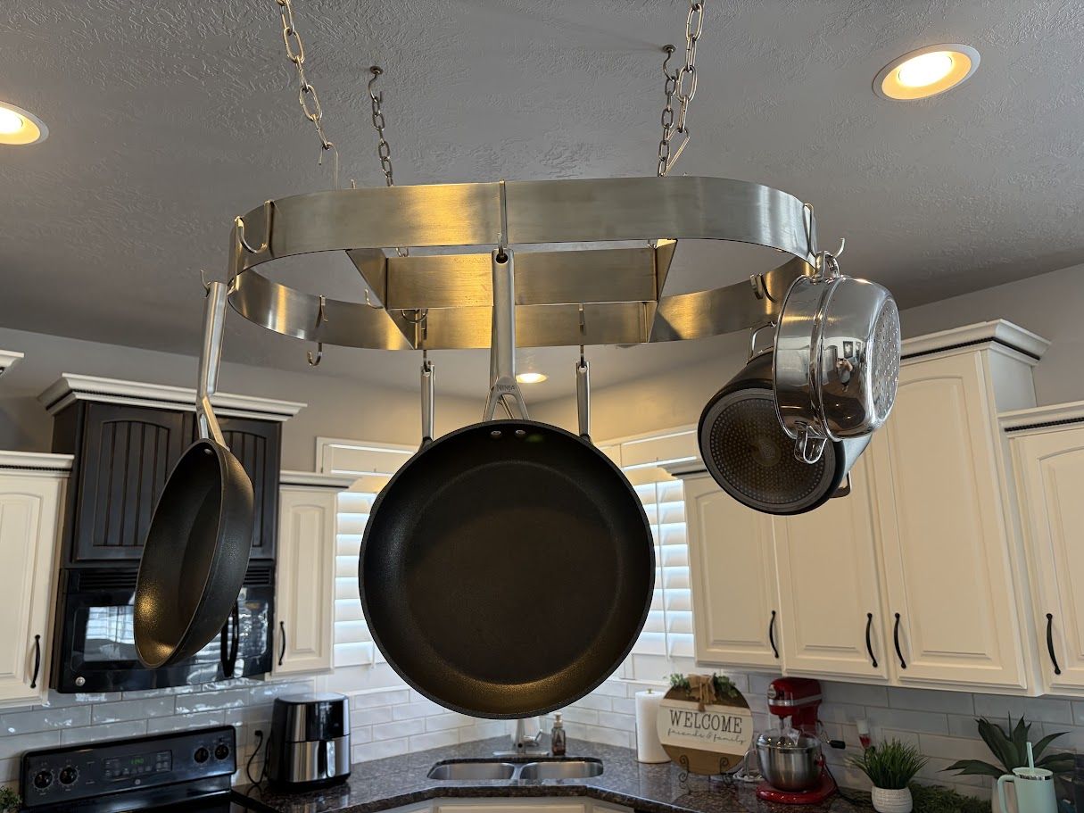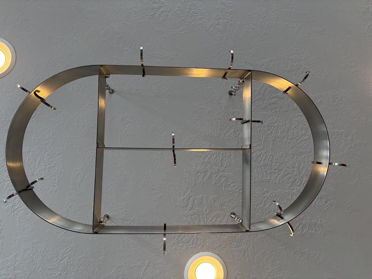 VenmoOval ceiling pot rack designed for over the stove or island. Affordable way to redecorate. Adds extra storage space for pots, lids and utensils. (X) Hooks included