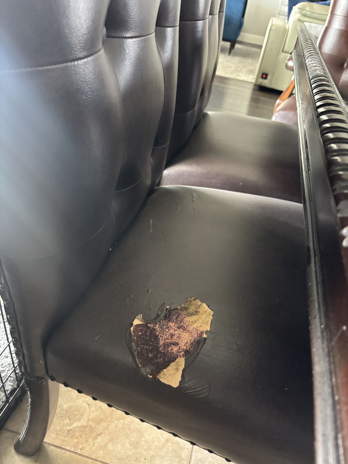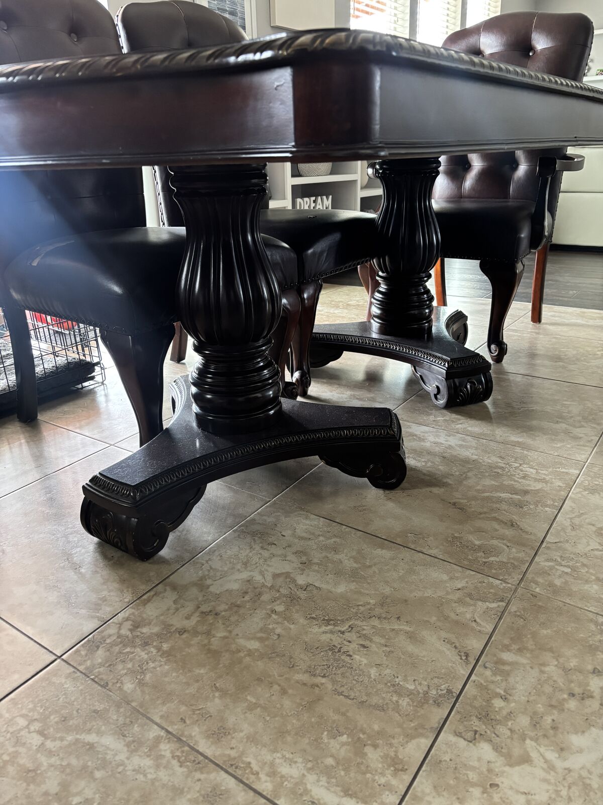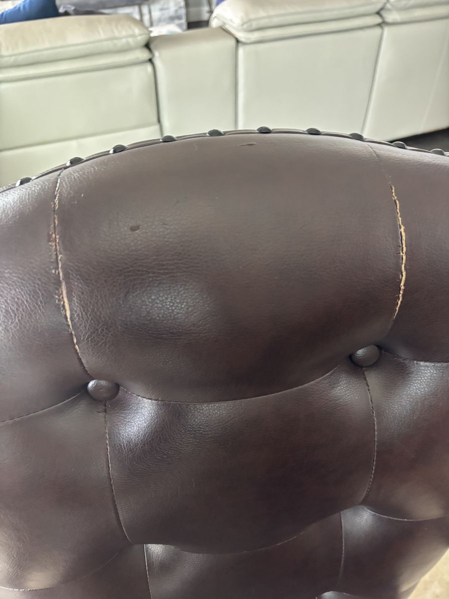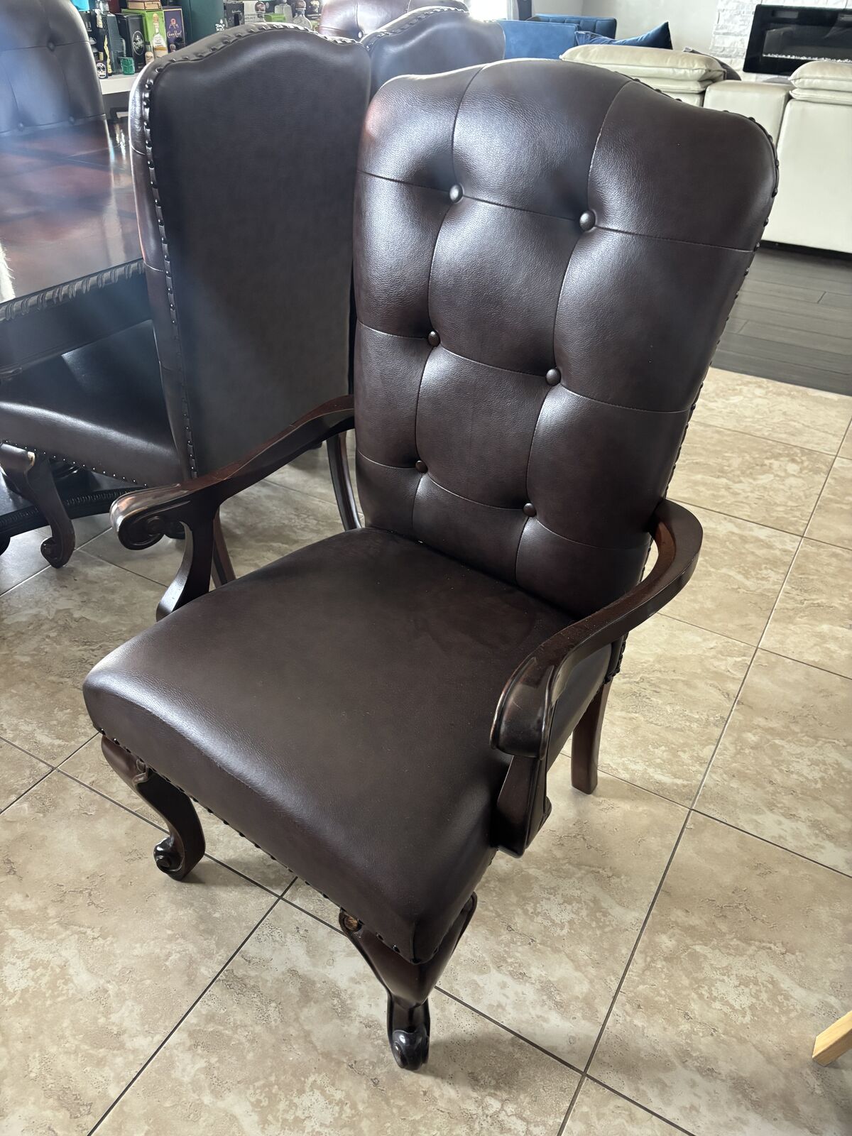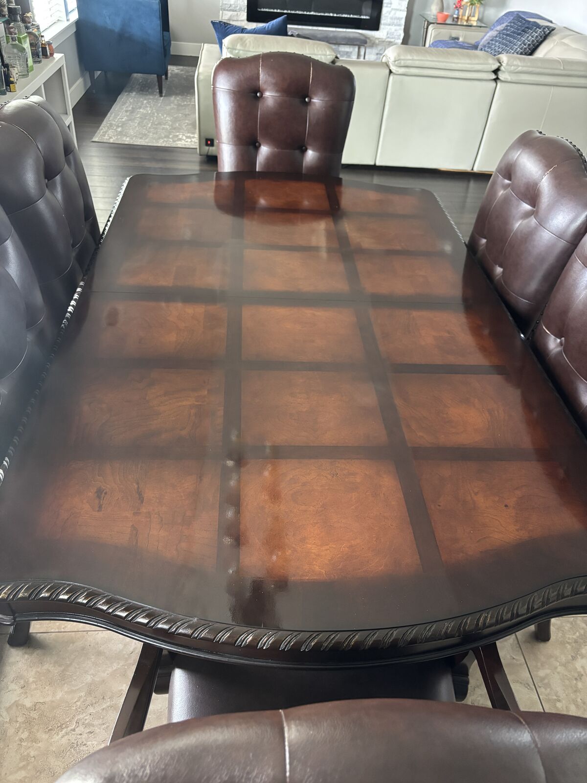 VenmoWood dining table with 6 chairs Table is in excellent shape, chair fabric is peeling can be reupholstered Pictures show chair blemishes
