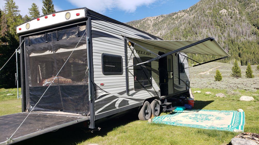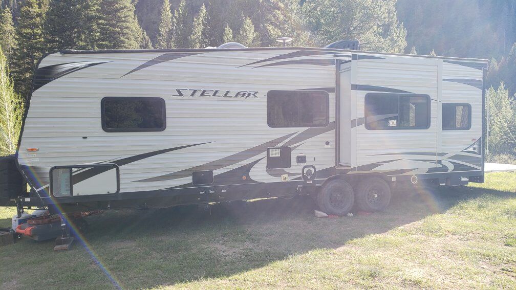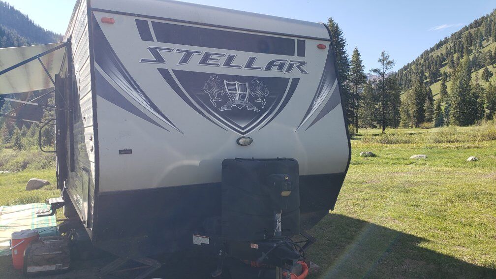 Stellar Eclipse 27FS Toy Hauler Tongue pull RV Trailer 27ft 2017 7420 dry wt. Light wt frame 4000w Onan Generator direct plumbed to gas tank 160w solar Power slide out Power awning Sleeps 8 ( power bunks) Cargo 14.75 ft 40 gallon gas tank for toys 100g fresh water tank, 50 g grey water tank, 50 g black water tank 6cf fridge 6 g hot water Heated underbelly DVD/ Stereo (TV not included) 13500 BTU ac 18000 BTU heater Has both indoor standing shower and outdoor shower Has outdoor speakers Very Good Condition. All Systems Work