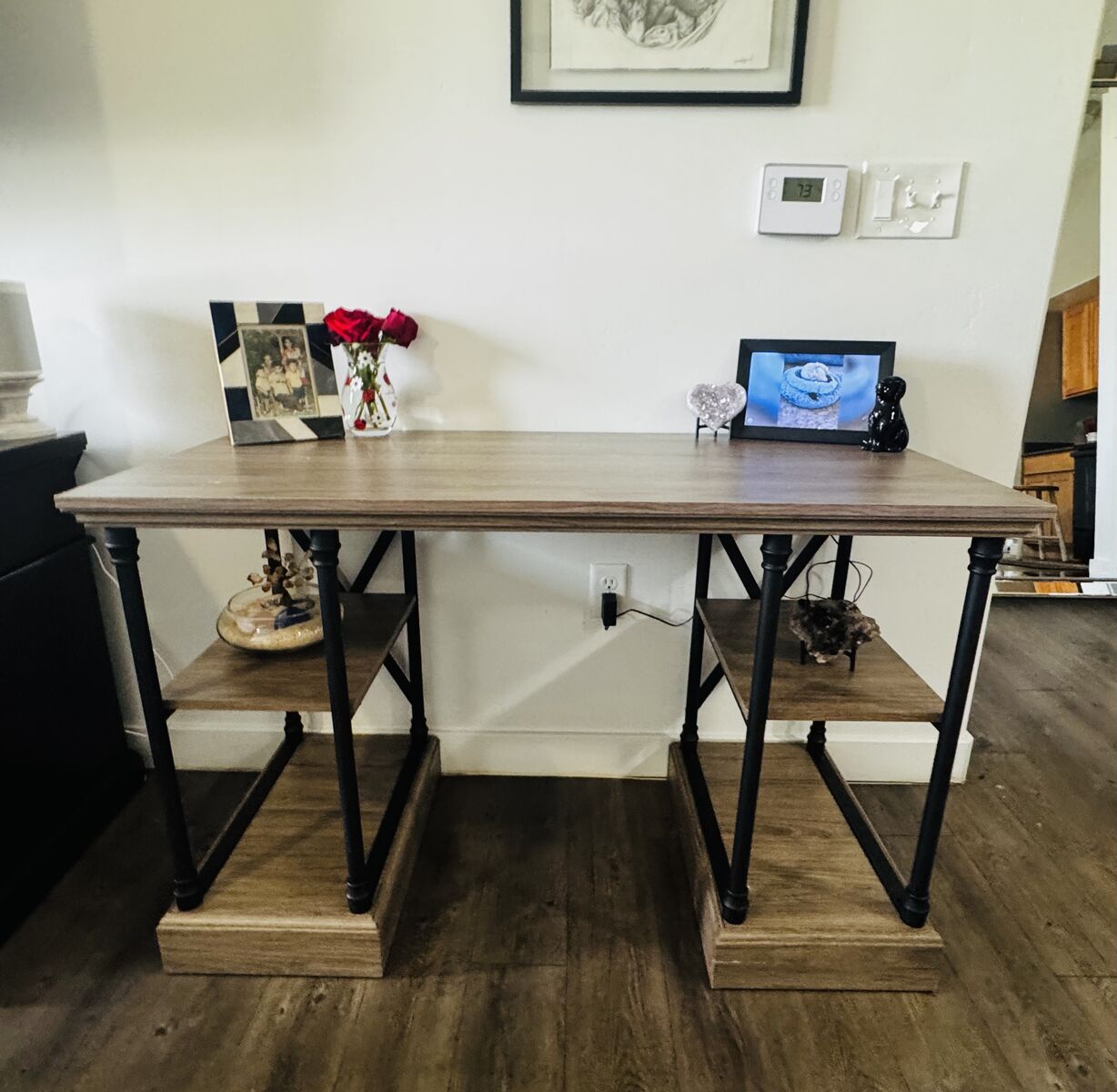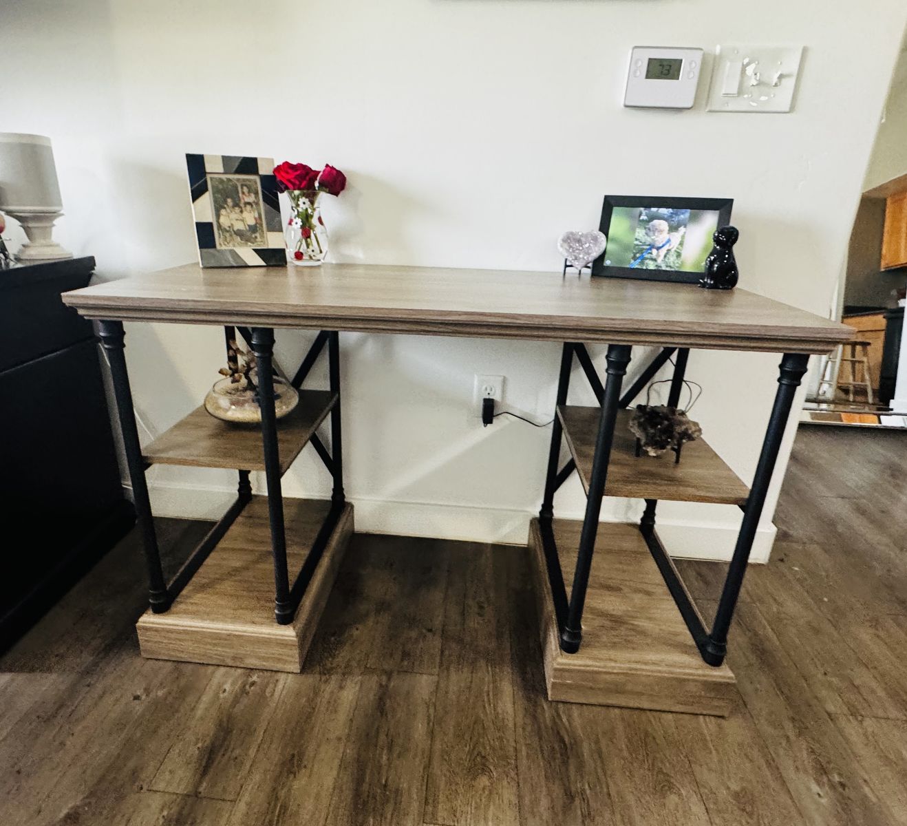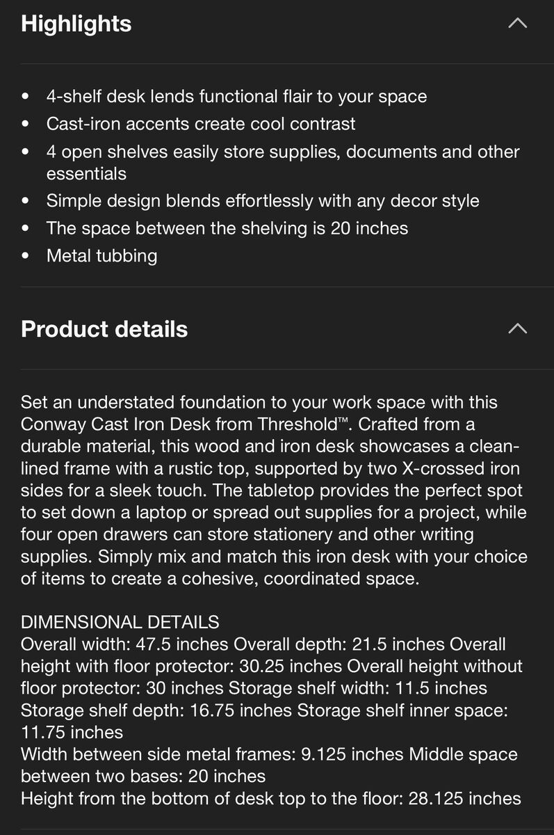 ApplePay• 4-shelf desk lends functional flair to your space • Cast-iron accents create cool contrast • 4 open shelves easily store supplies, documents and other essentials • Simple design blends effortlessly with any decor style • The space between the shelving is 20 inches • Metal tubbing