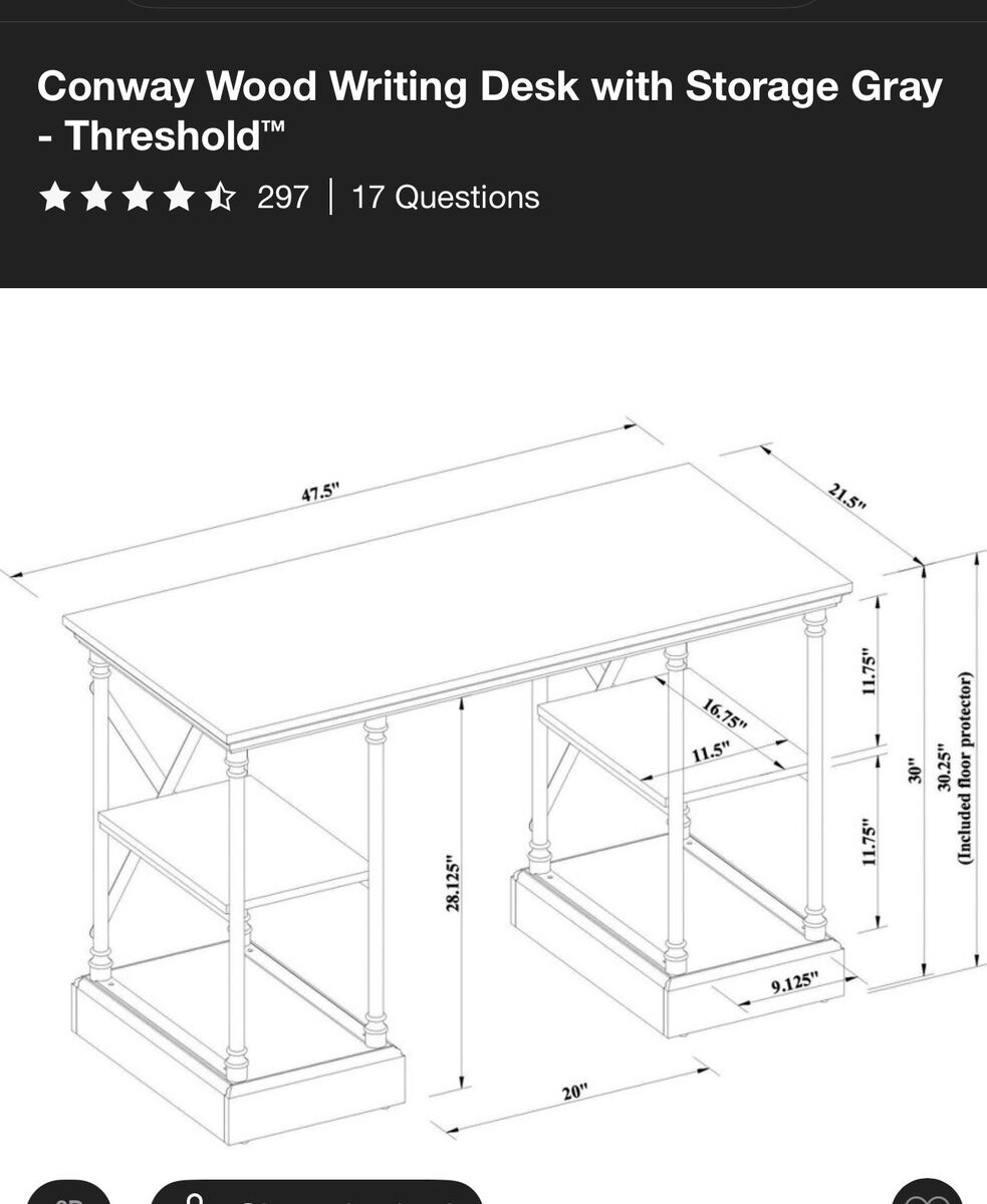 DIMENSIONAL DETAILS Overall width: 47.5 inches Overall depth: 21.5 inches Overall height with floor protector: 30.25 inches Overall height without floor protector: 30 inches Storage shelf width: 11.5 inches Storage shelf depth: 16.75 inches Storage shelf inner space: 11.75 inches Width between side metal frames: 9.125 inches Middle space between two bases: 20 inches Height from the bottom of desk top to the floor: 28.125 inches