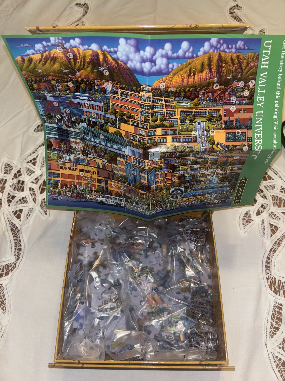 Awesome DOWDLE puzzle with a cool Utah Valley University (UVU) theme. Has 500 pieces and is 16x20 inches. Pieces are still sealed in bags, so it's never been put together. Comes with the guide poster too.