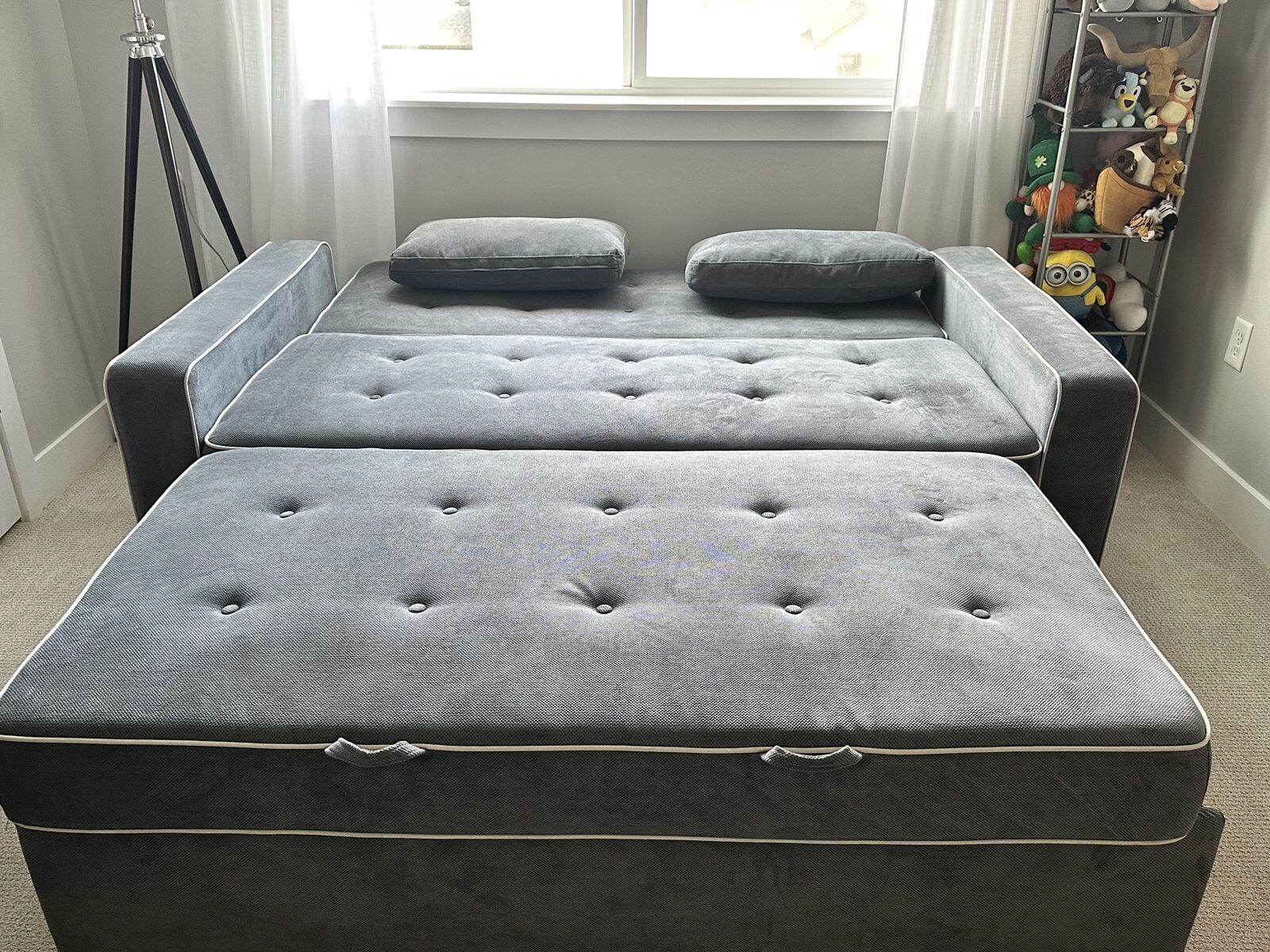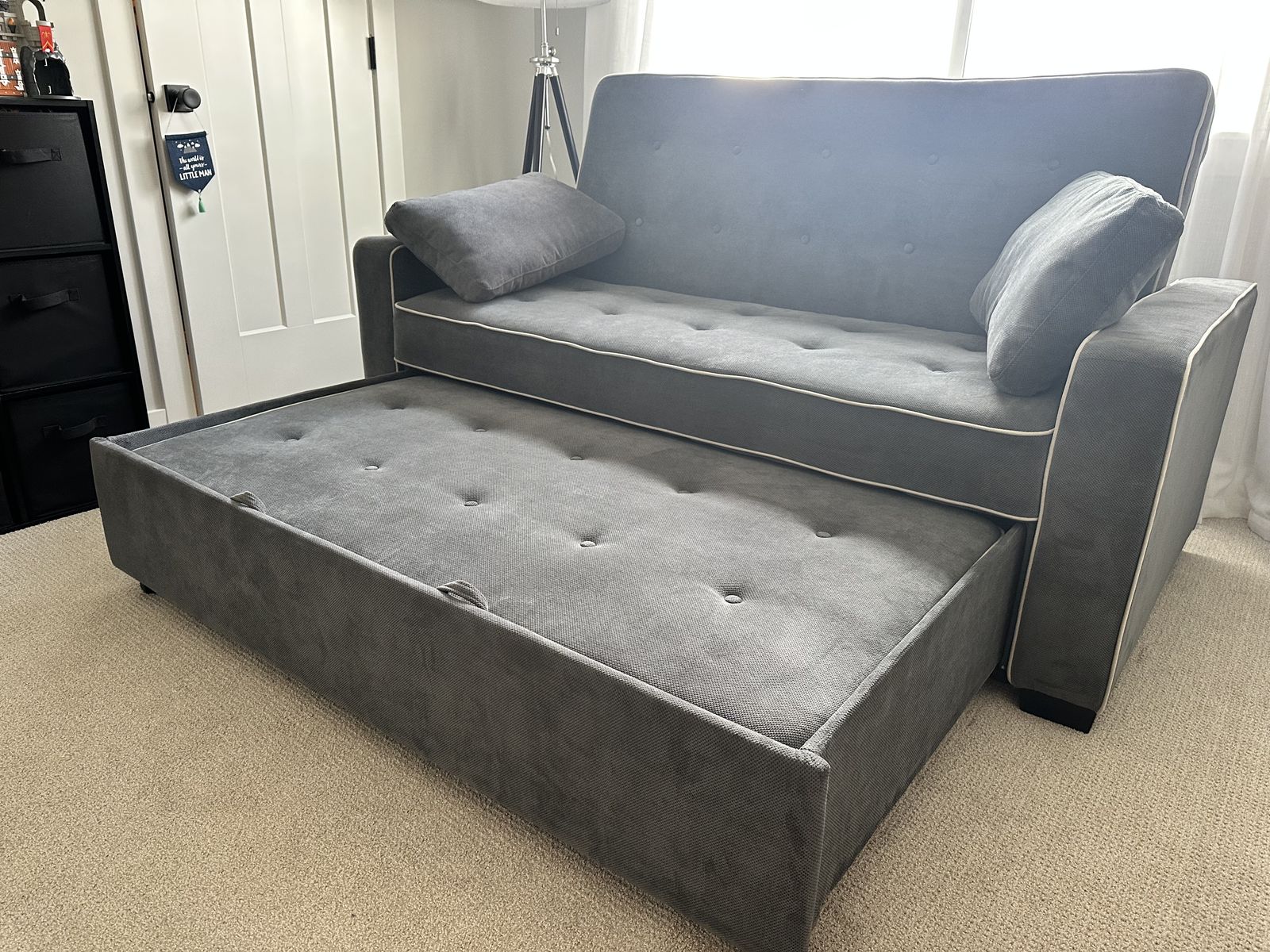 VenmoSerta Augustus 66.5 in. Grey Polyester Full Size Sofa Bed. Only ever used as a couch in guest room. One pillow is slightly discolored due to the sunlight. HEAVY. Pick up in Draper.