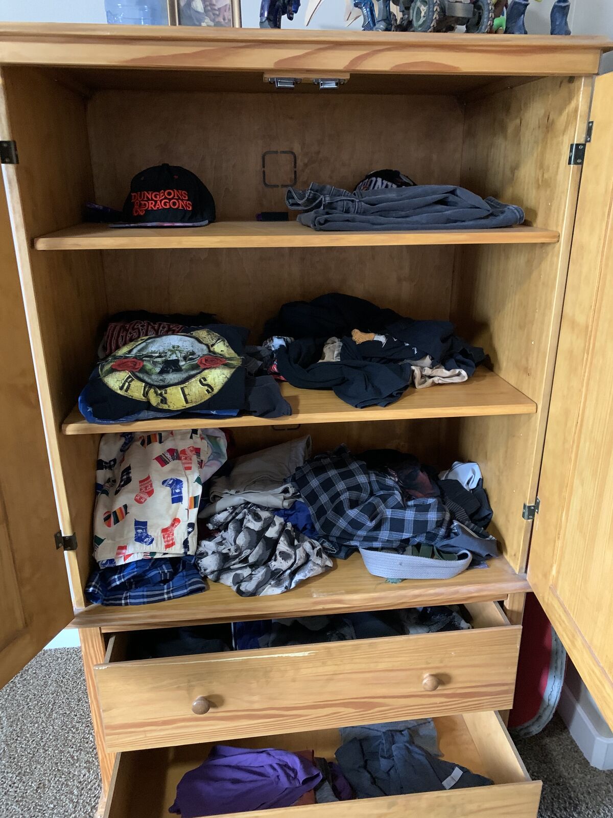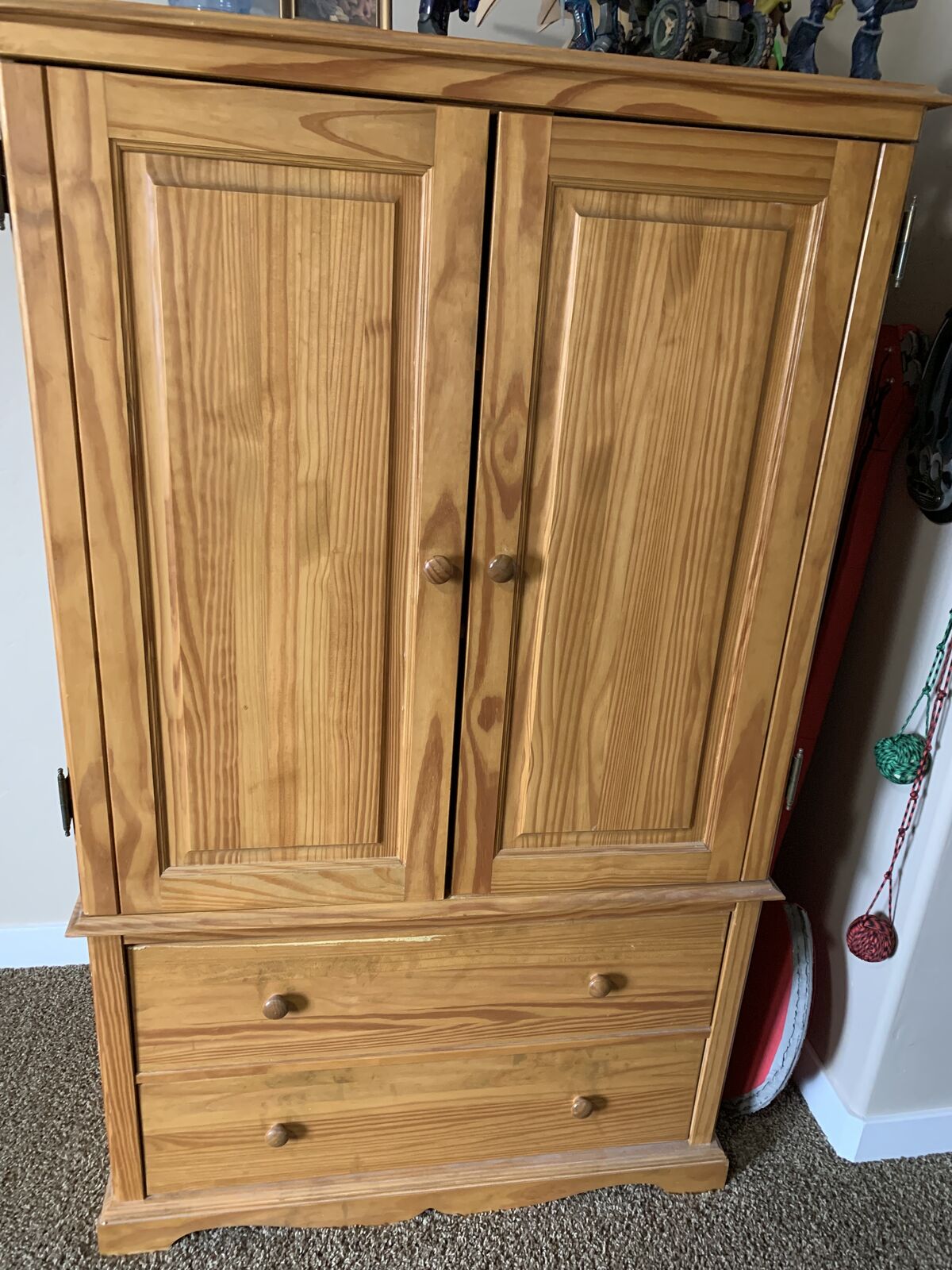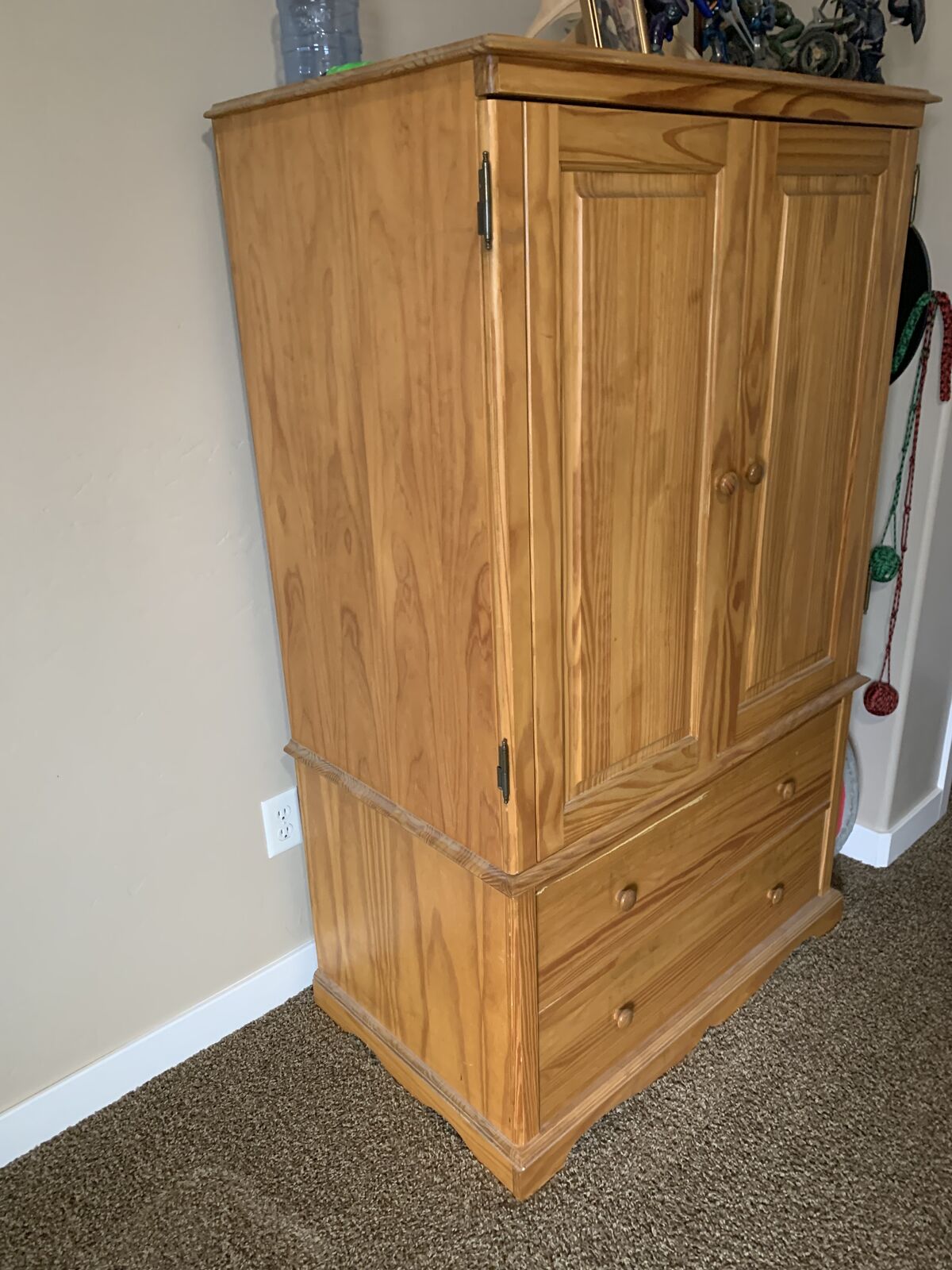 VenmoThis is solid wood and the measurements are 51.5” tall 36” wide and 22.5 deep. It has 2 big drawers and 3 huge adjustable shelves inside the doors. The only flaw is a little crack that I glued with gorilla glue as seen in the pictures. Cloths are not included hahah. Thanks for looking.
