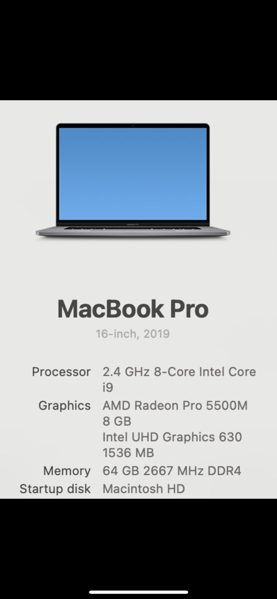 • 2.4 GHz 8-Core Intel Core i9 • 64GB RAM (maxed configuration) • 1TB SSD • AMD Radeon Pro 5500M 8GB Graphics • 16-inch Retina Display