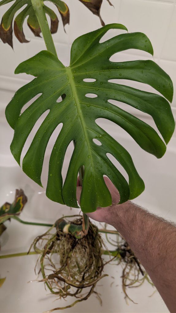 Cutting has a tons of roots and a new leaf that has fenestrations and a few holes. The original leaf doesn't look great, but still has a little life left in it.