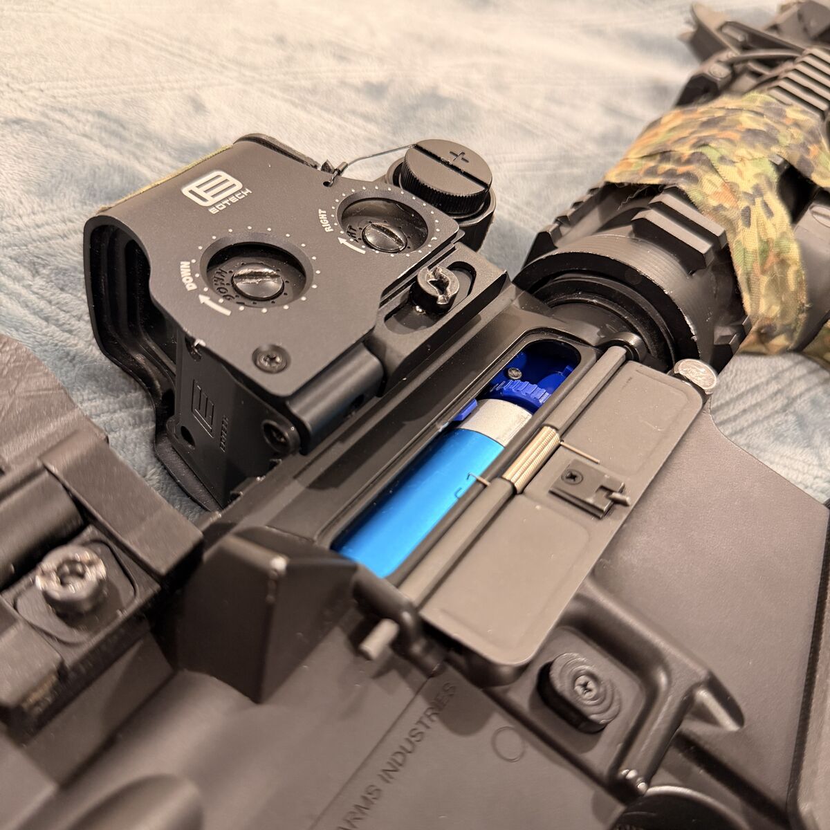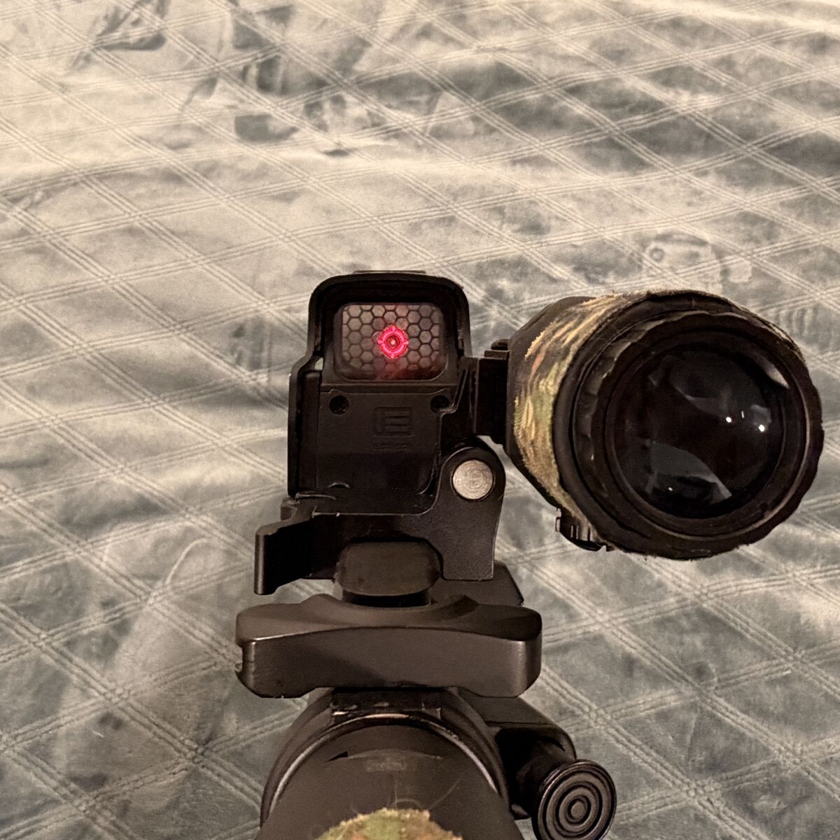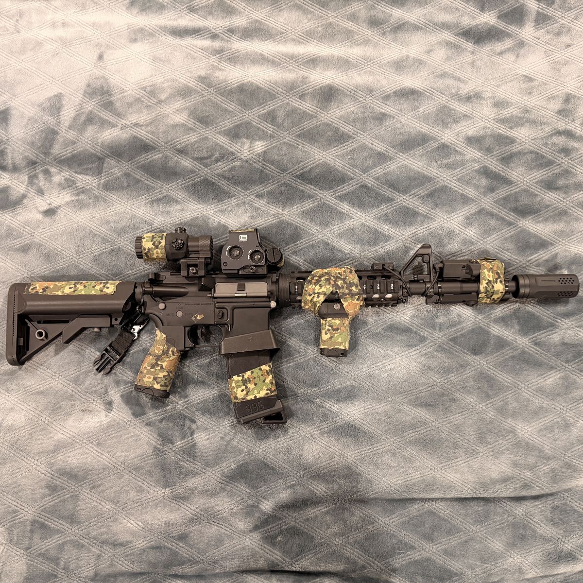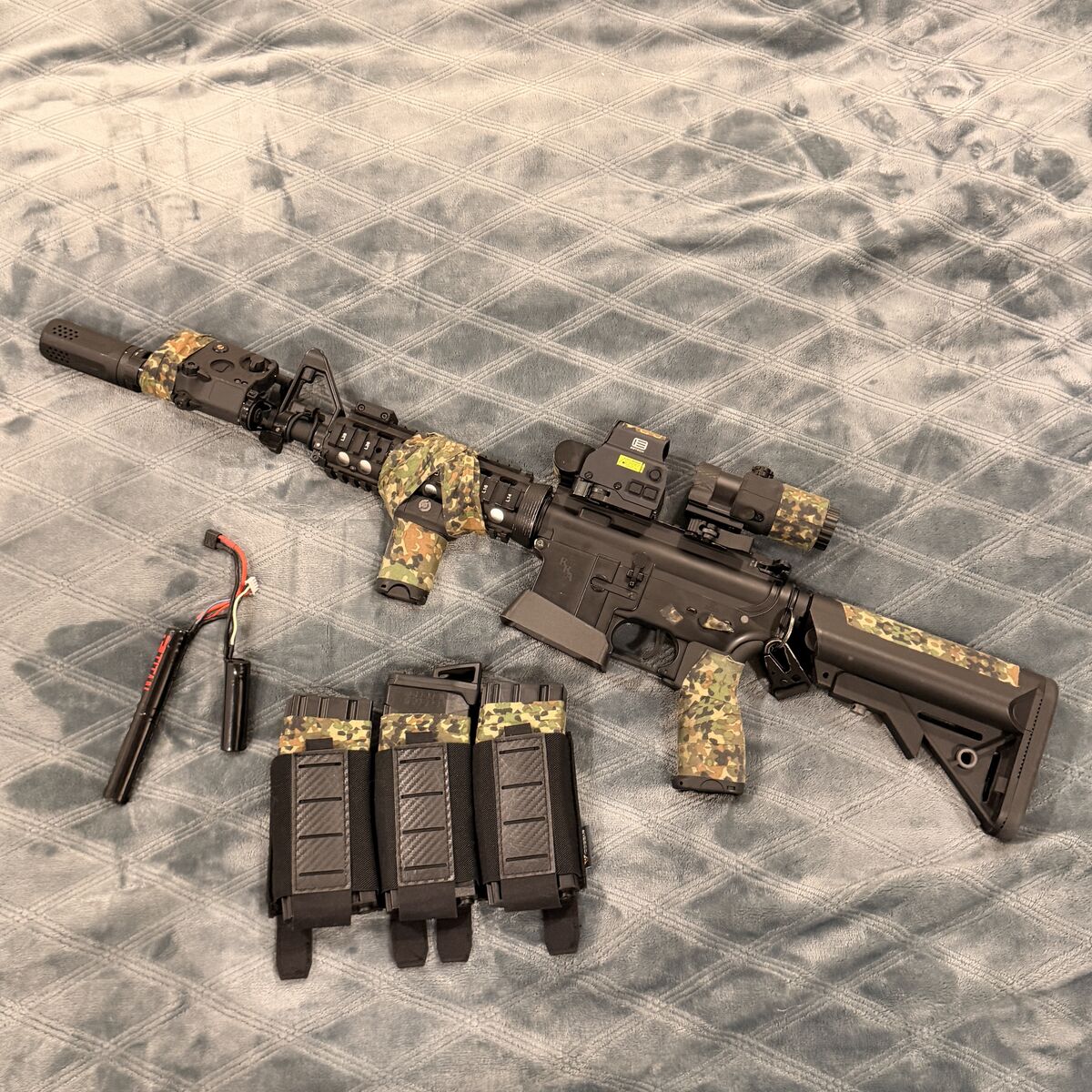 VenmoSpecna Arms SA-E03 electric airsoft rifle. comes will all accessories seen including a eotech, 3x magnifier, killflashes for eotech and magnifier, light and laser combo, mod light button, flared magwell, sling mount, front angled foregrip, multicolor tracer unit, and multicam GOON tape all over. also comes with a couple extra mags and a 3 slot carbon fiber mag pouch, battery i’ll throw in for another 15 bucks