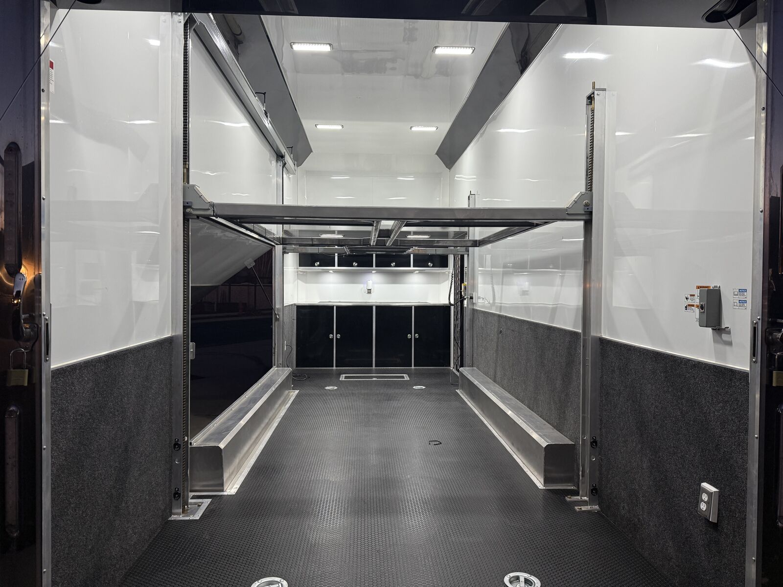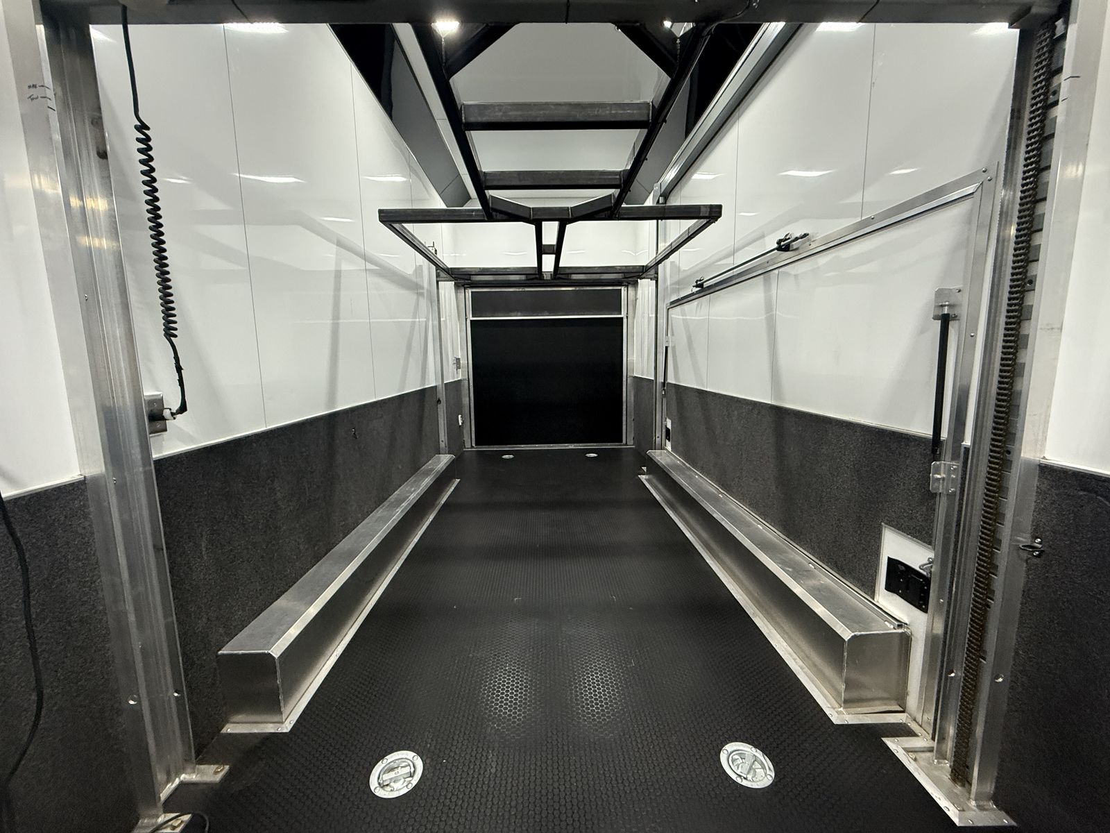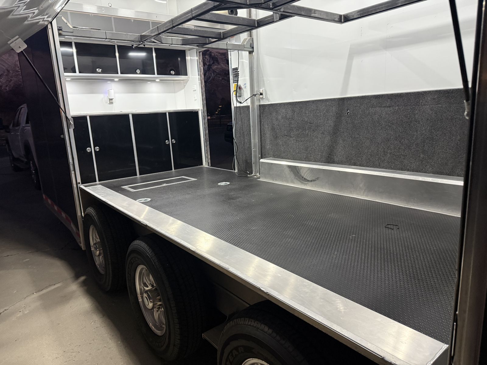 Quest 305 Aluminum Trailer8.5'W x 24'L x 11.33'H, (3) 6000# Torsion Axle(s) COLOR: POLAR WHITE COLOR - CABINETS: BLACK DOT TAPE 24 ft STD WHEEL BOX - SMOOTH AL STACKER - ST 305 BATTERY - 12V AGM (930 CA, 775 CCA) BATTERY BOX - IN-FLOOR - HOLDS UP TO 3 BATTERIES SWITCH - POWER CUT-OFF - MANUAL - 12V BREAKER BOX - 50 AMP - 120V ONLY - 60 AMP CONVERTER - 12V FUSE PANEL - INTELI-POWER UNIT CABINET - ALUMINUM - LOWER - STRAIGHT - FULL WIDTH CABINET - ALUMINUM - UPPER - STRAIGHT - FULL WIDTH - W/ RADIUS COUPLER - FLAT NOSE - 2-5/16" - 25,000# CROSS MEMBERS - ROOF - 16" O/C - 1" X 2" DOOR - REAR RAMP - HD PREMIUM - CONTINUOUS ALUMINUM HINGE - 3600# RATED MAX LOAD 6000# VEHICLE LOAD DOOR OPENING HEIGHT - REAR - 90" TRANSITION FLAP - TPO - BLACK COIN - 16" RAMP DOOR FLOORING - REAR - TPO - BLACK COIN DOOR LATCH - PADDLE - STAINLESS STEEL STEP - SLIDE IN/OUT - ALUMINUM - 36" EXTERIOR ALUMINUM THICKNESS - .050 FLOORING - TPO - BLACK COIN GRAVEL GUARD - ATP - 48" INTERIOR HEIGHT - 11.3' INTERIOR CEILING - SCREWLESS ALUMINUM INTERIOR WALLS - SCREWLESS ALUMINUM INTERIOR WALLS - BEDRUG - 40" HIGH JACK - STABILIZER - POD - 3000# LIFT SPLIT RAIL DESIGN 6000# CAPACITY 4 1/2" THICK TILT CAPABILITY