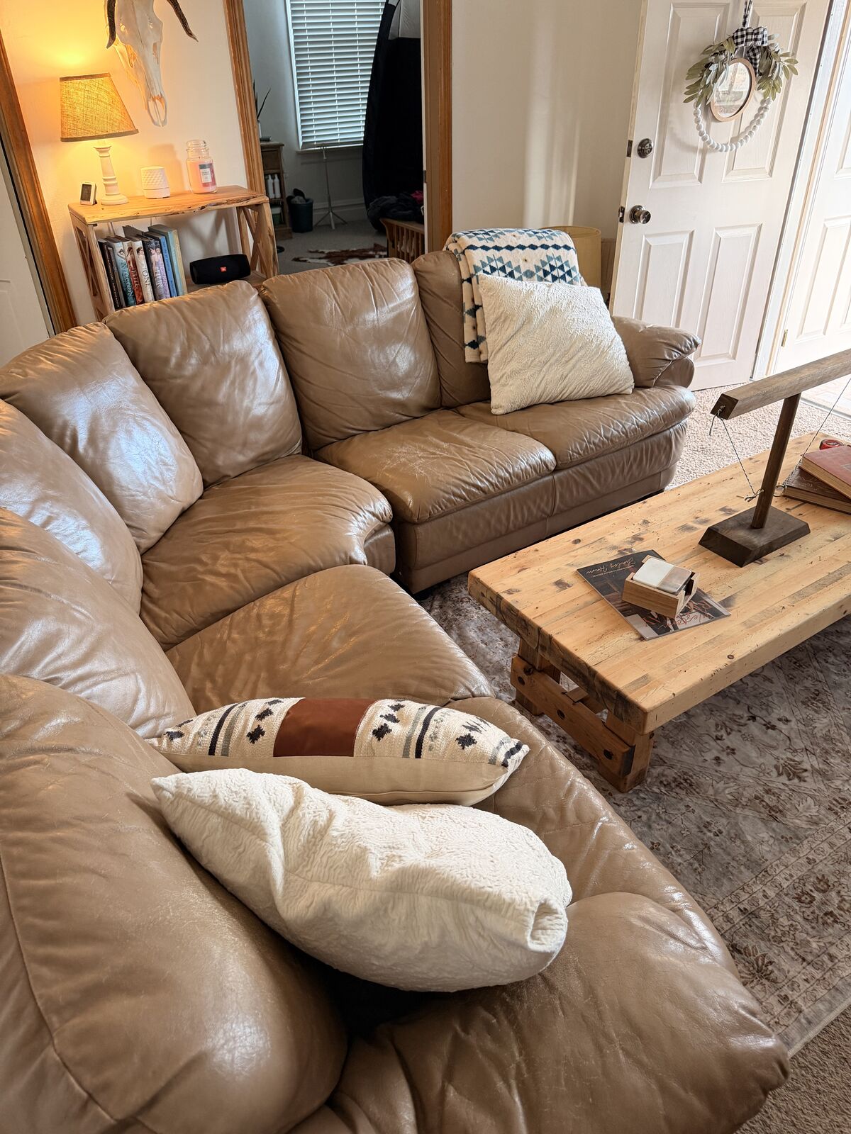 VenmoCute small leather sectional. Used but in good condition. You can see the spots that are worn but I used a blanket and pillow and it came together great! Let me know if you have any questions. Make me an offer.