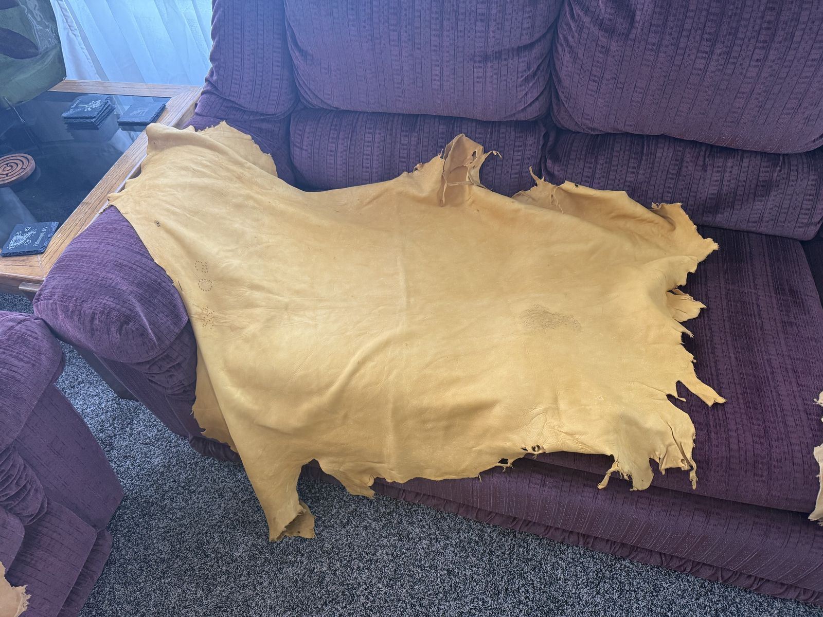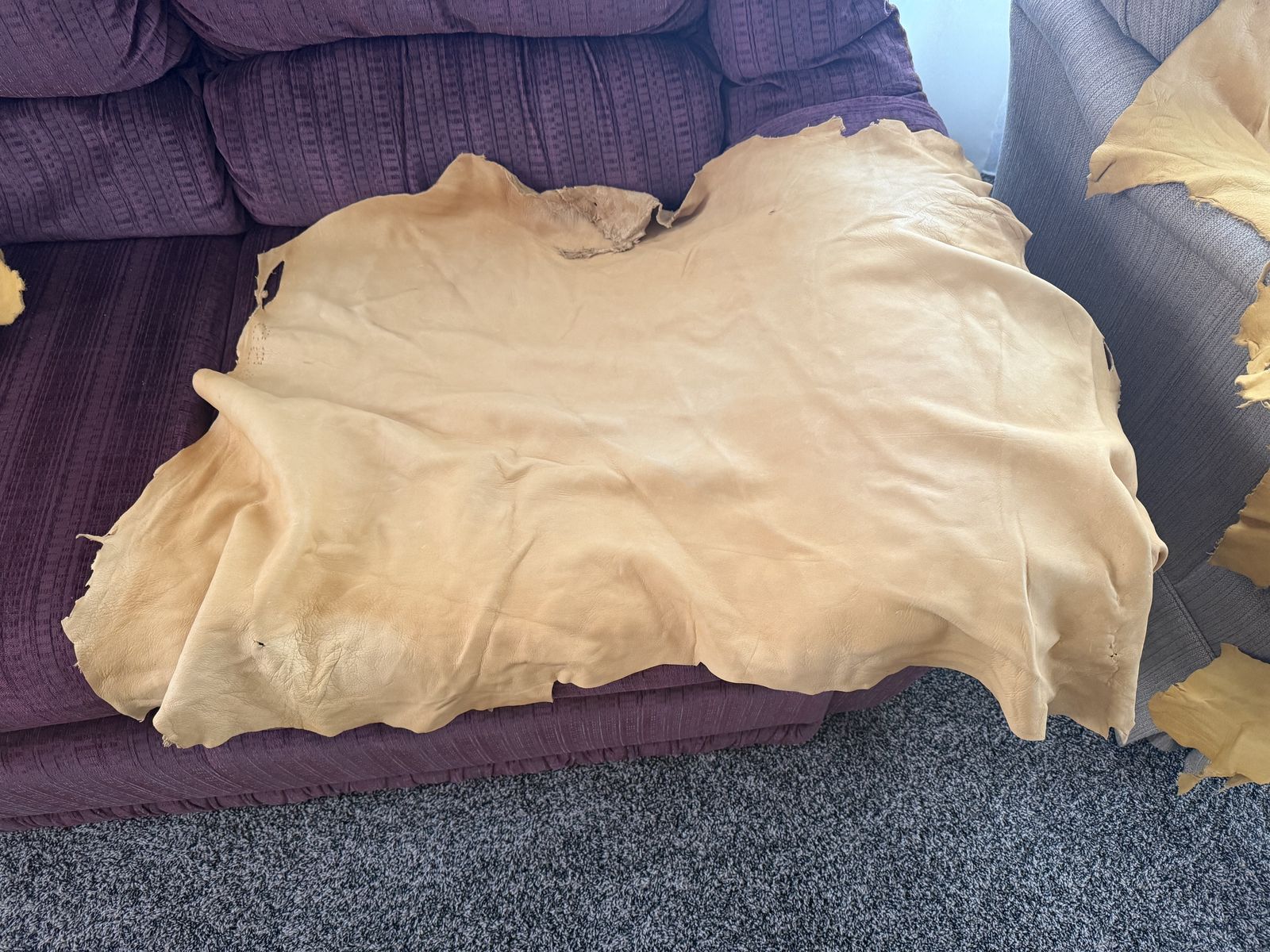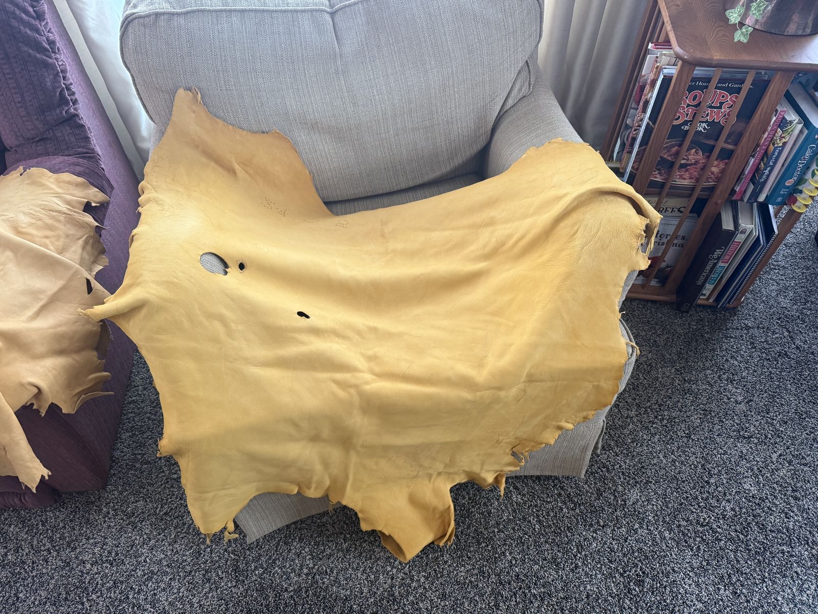 $12 per square foot. We will measure it together. I have two full beef hides cut down the back into two pieces each, two deer hides and one elk hide. All are soft flexible finish. Not for tooling. Excellent for making gloves, knife scabbards, hand bags, etc.
