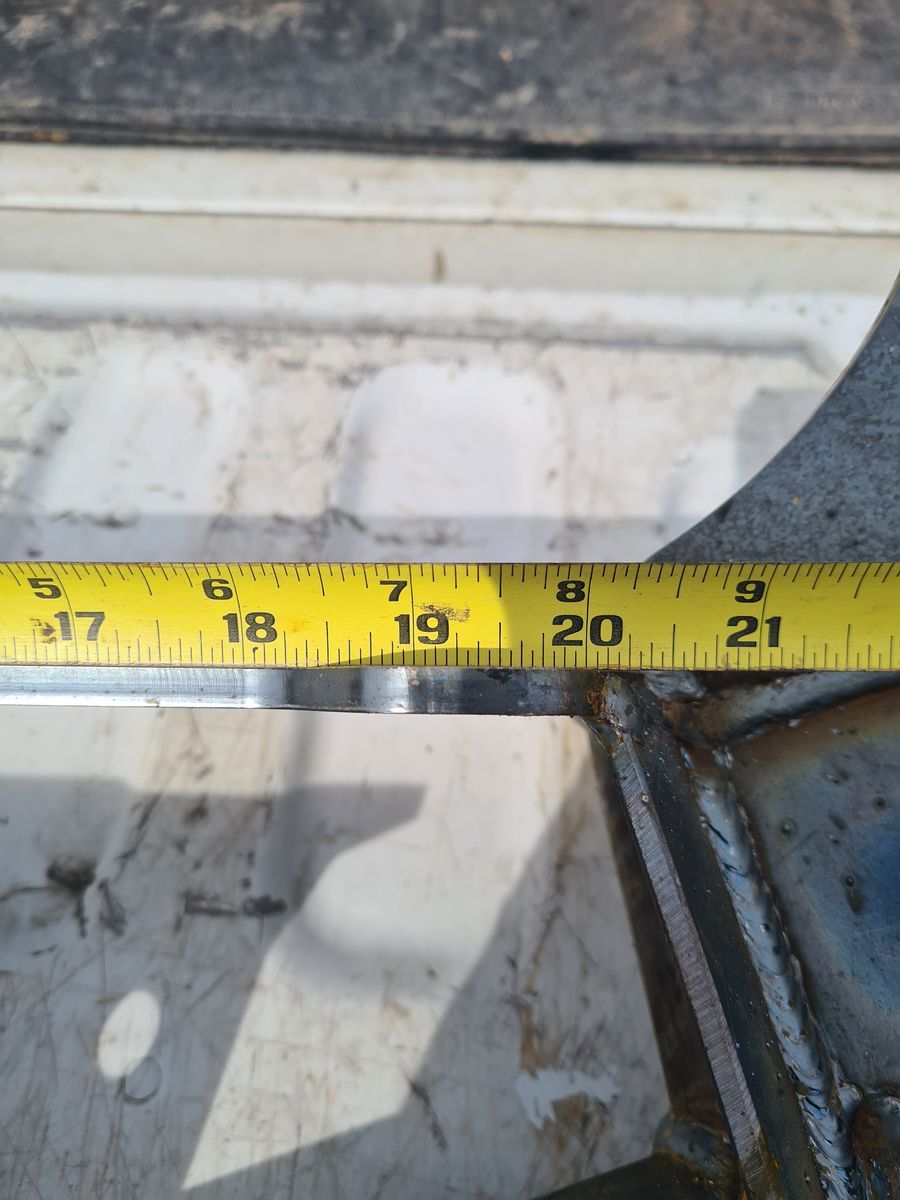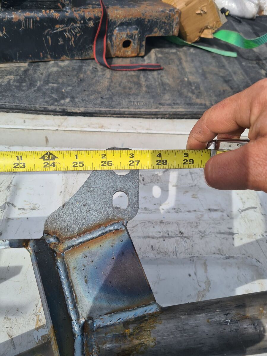 67" overall width. Inside front plate mounts are 19" center to center. Outside front plate mounts are 25-1/4". Top mounts are 26-1/2" wide.