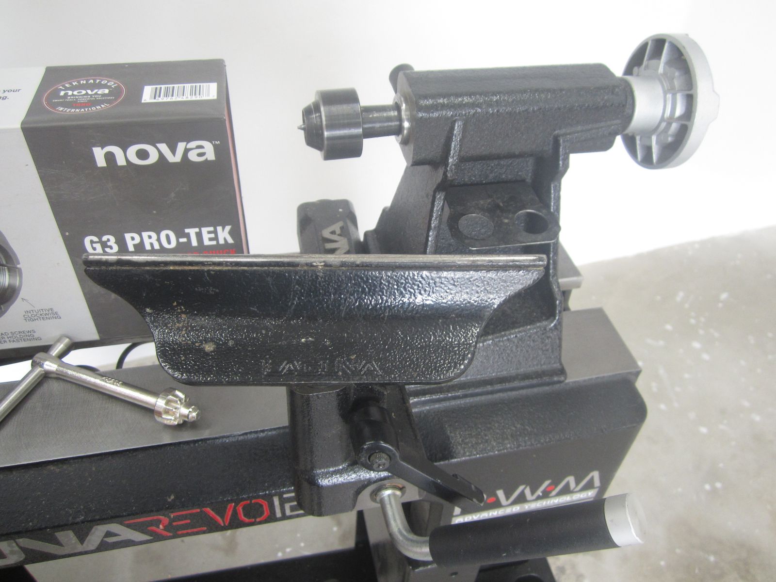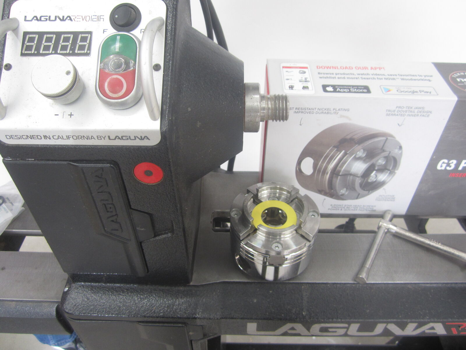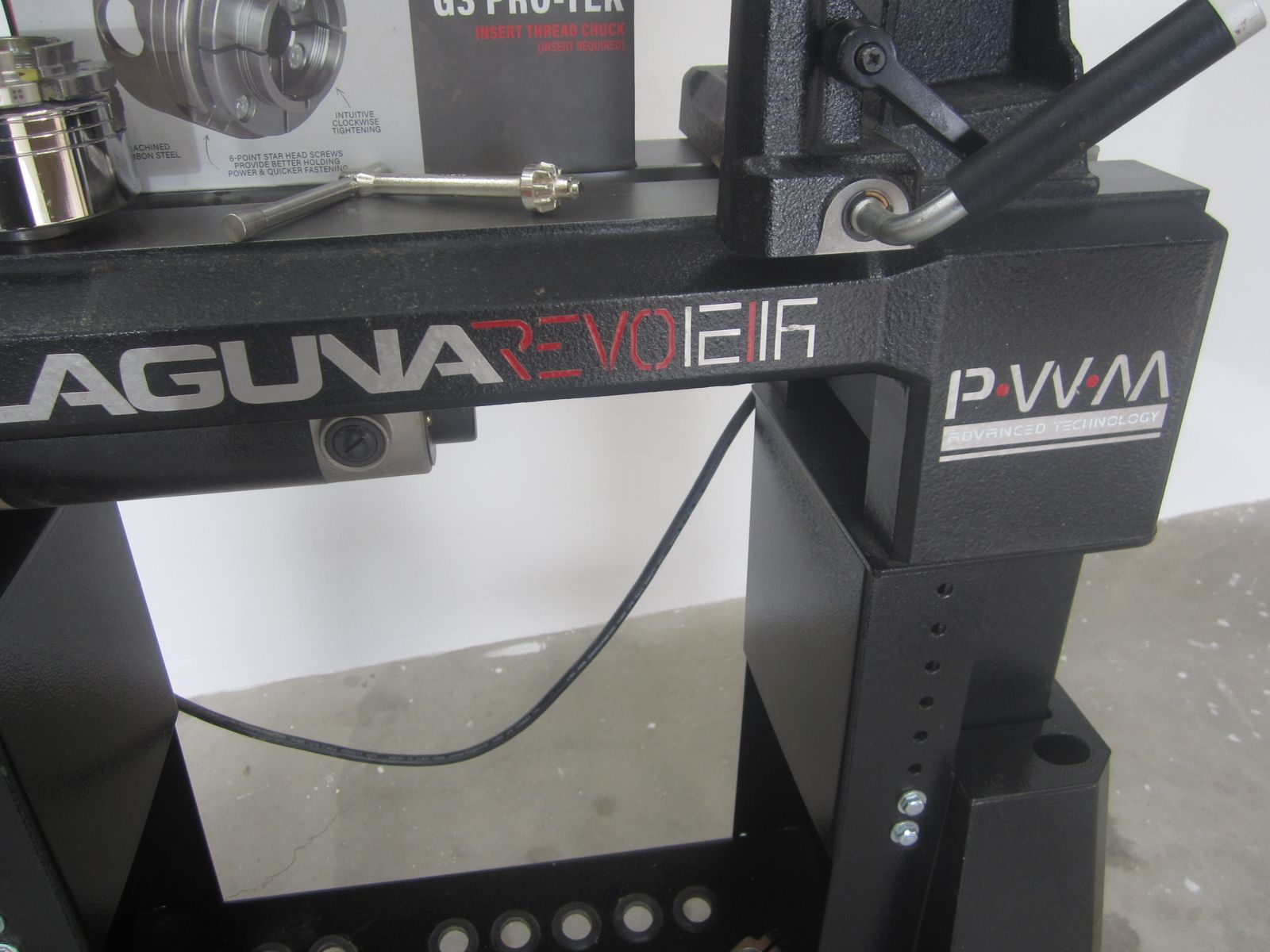 VenmoUp for sale is a Laguna Revo 12/16 Wood Turning Lathe. This comes with the Laguna Revo 12/16 Adjustable stand, a Nova G3 Pro-Tek chuck, with the standard jaws and a new (never used) Nova Mini Cole Jaw set, two tool rests (8" and 4"), the knock-out rod, and a light on an articulating arm. It also comes equipped with the Laguna Revo 12/16 Wheel System and a 10" Expansion Set.