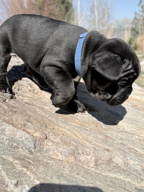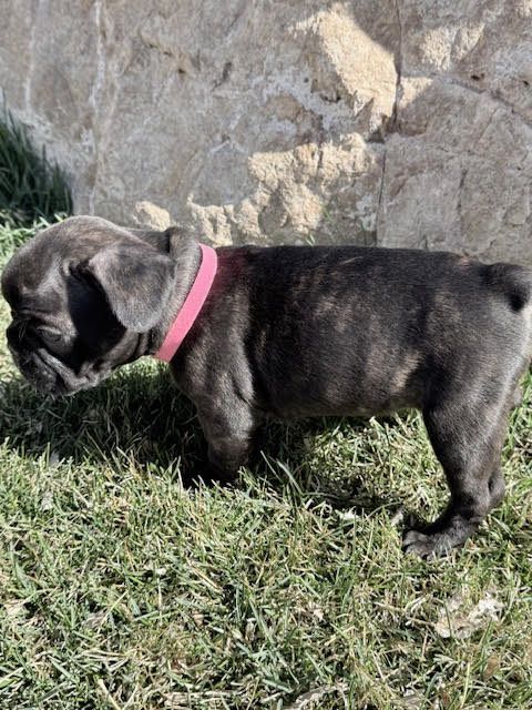 Marie-Brindle Female (pink collar) is our big girl. She is holding her own with the big boys. Her brindle coat is vibrant. She is spunky and adventurous. She loves humans and loves to be held. She is mostly black in color, and has very pretty brown brindle striping. She is still working on her big girl ears. At 7 weeks old, Marie weighs 5 pounds.