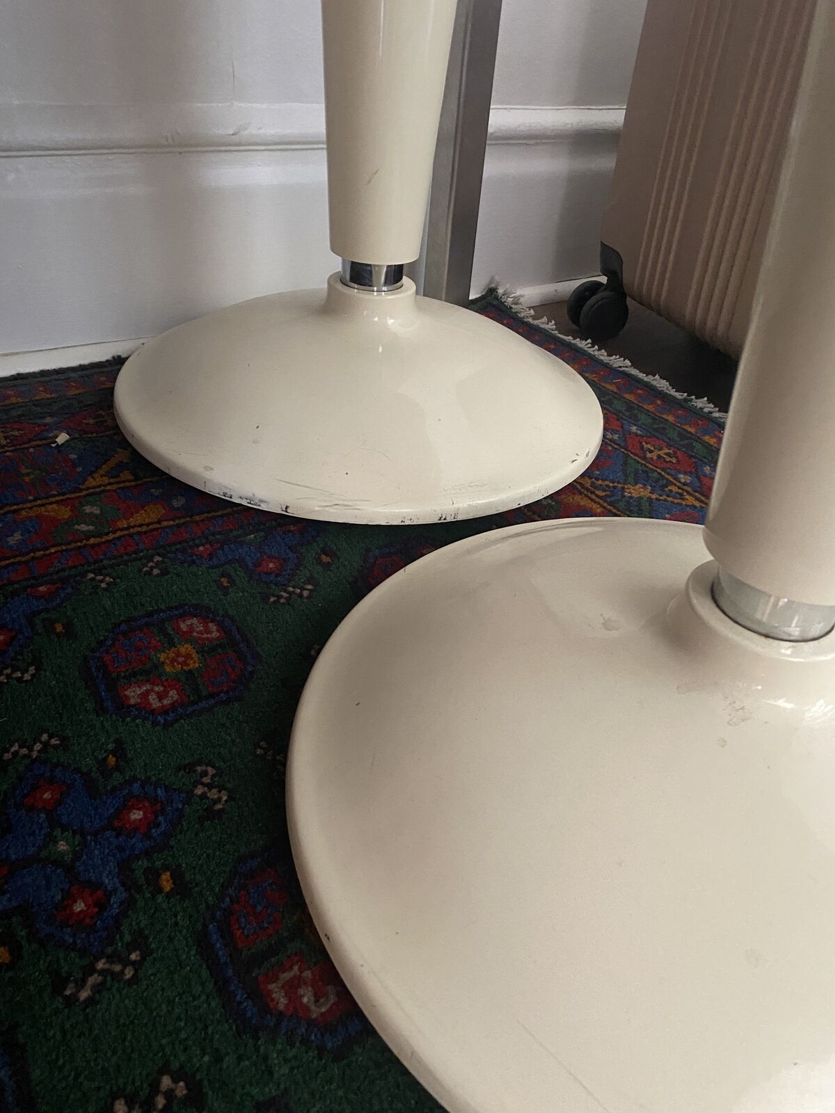 I have three of these cool stools. At their shortest they are 22" and 29" at their tallest. Very cute and quite the vibe. The wobble around which is fun. $60 for three, not selling individually. Cash only, downtown SLC.