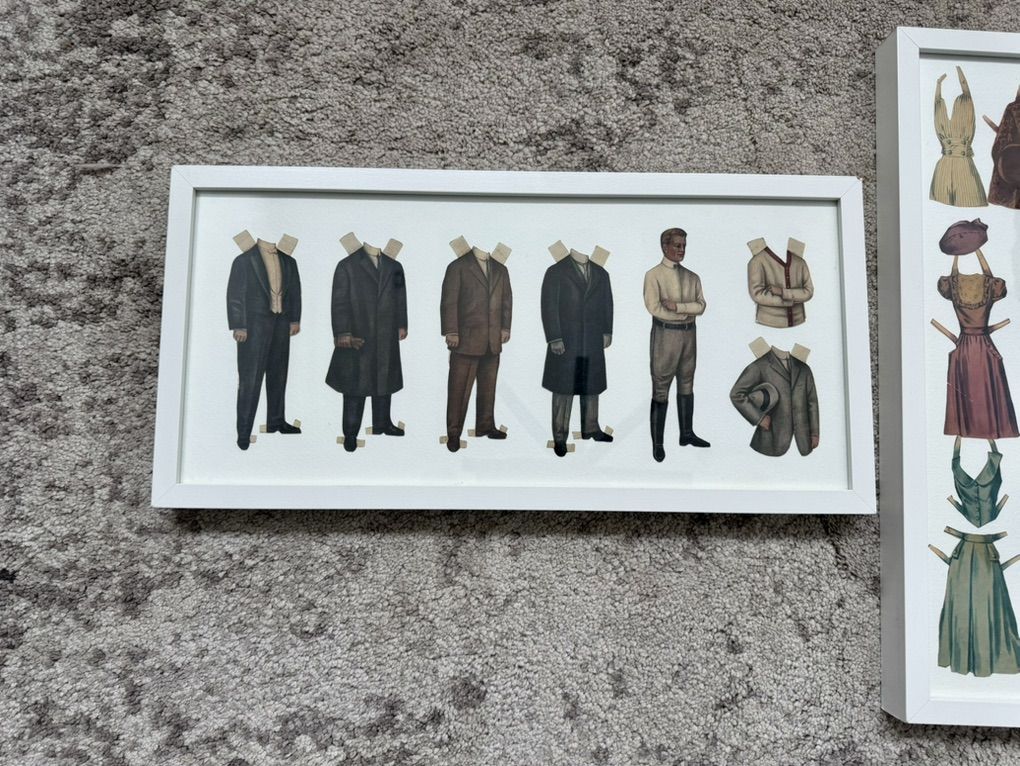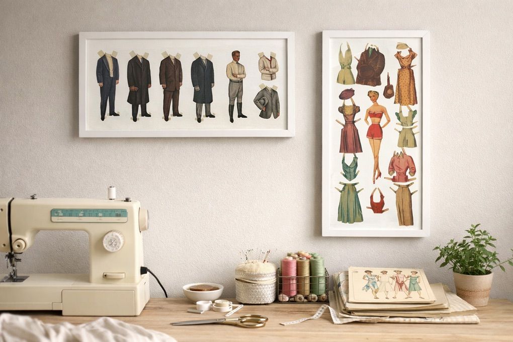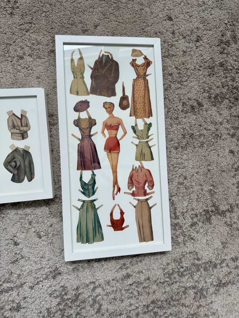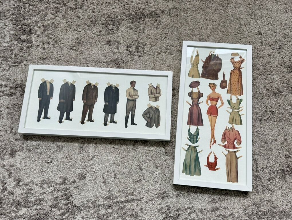 ApplePayThis framed duo features classic mid-century style men’s and women’s paper dolls with interchangeable outfits — giving total retro sewing room, craft studio, or boutique vibes.