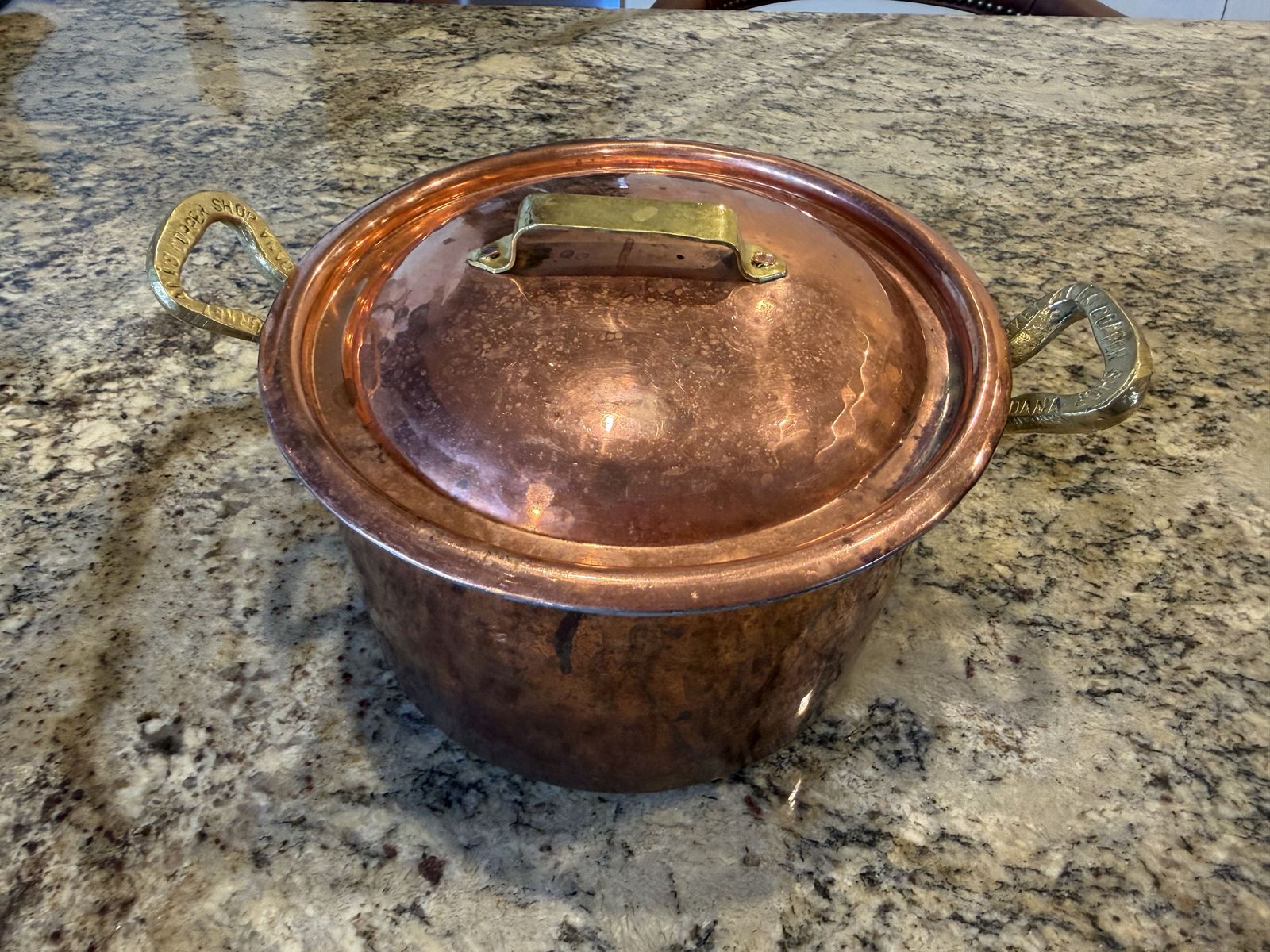 Ali's Copper Shop, Copper pan and pot set. The set includes 4 pots and 5 pans and a ladle. All but one pot have matching lids.