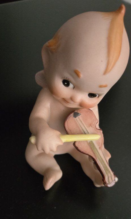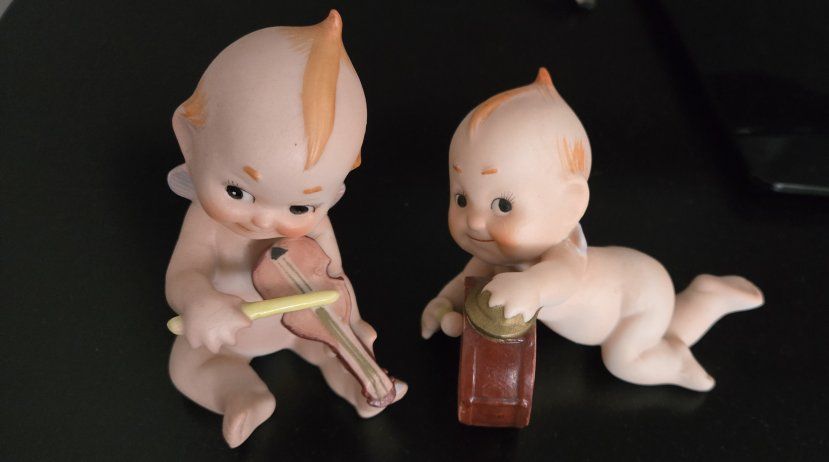 2 vintage 1940s porcelain kewpie dolls musicians. 41/2" tall and length.