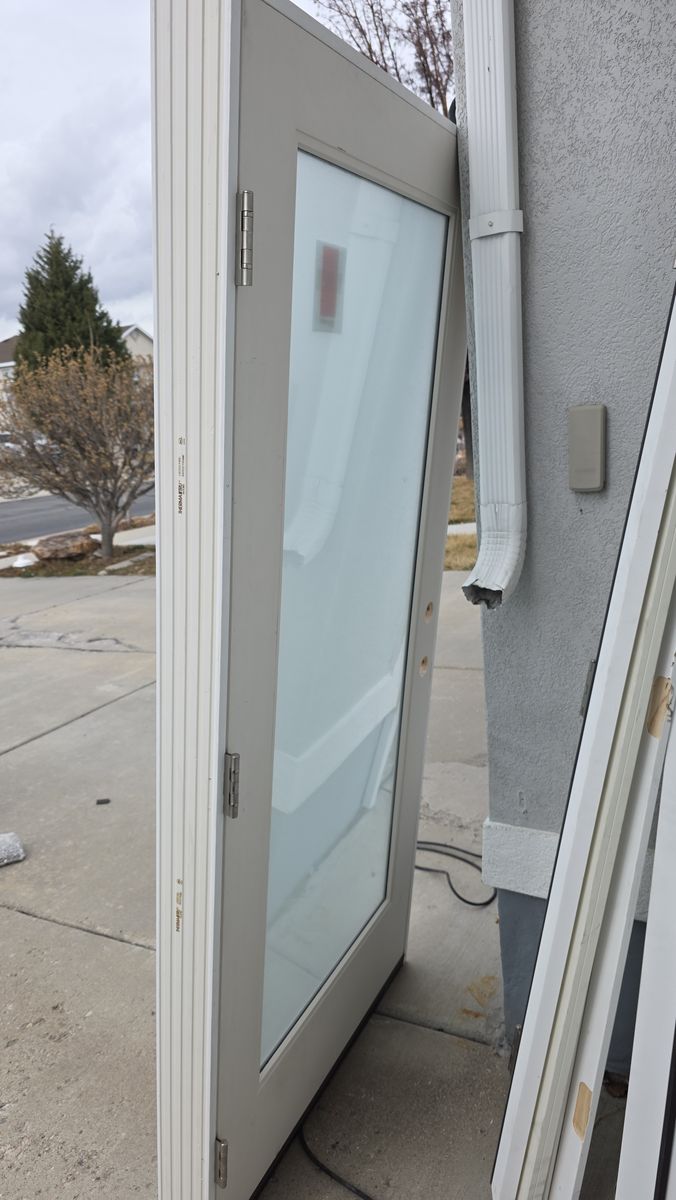This really nice Therma-Tru fiberglass entry door is perfect for bringing in natural light while maintaining complete privacy. clean white finish, it's built for durability, energy efficiency, and modern style. Features include: