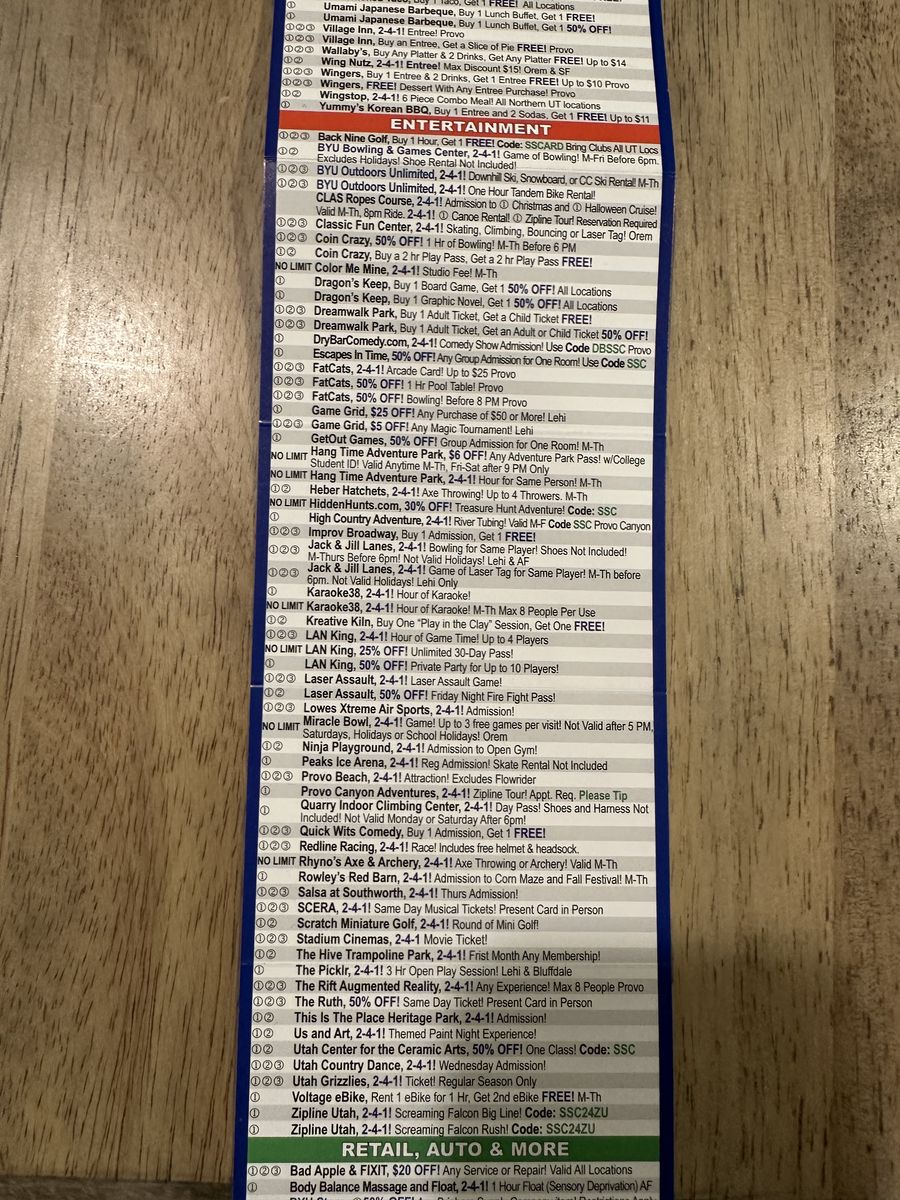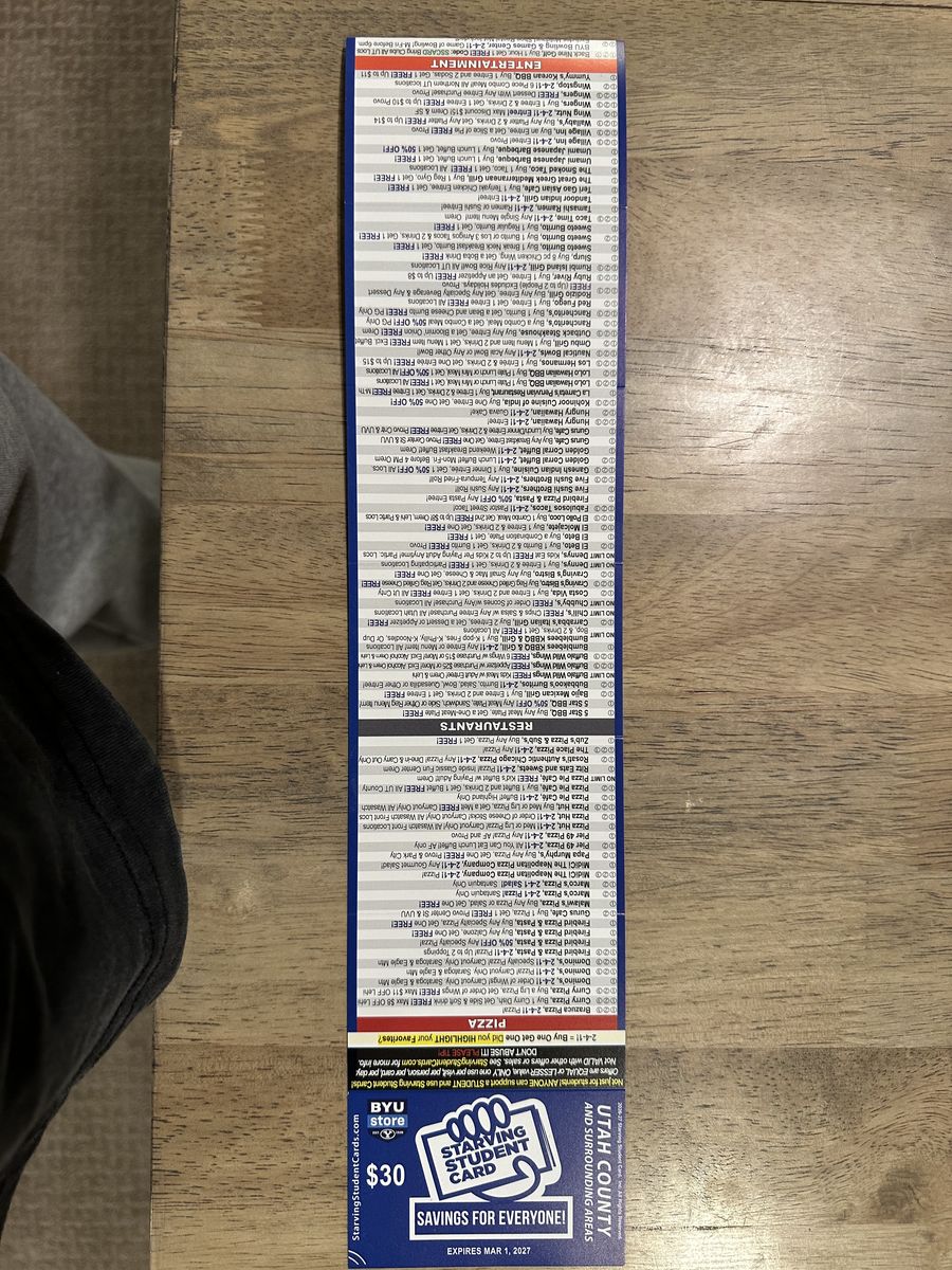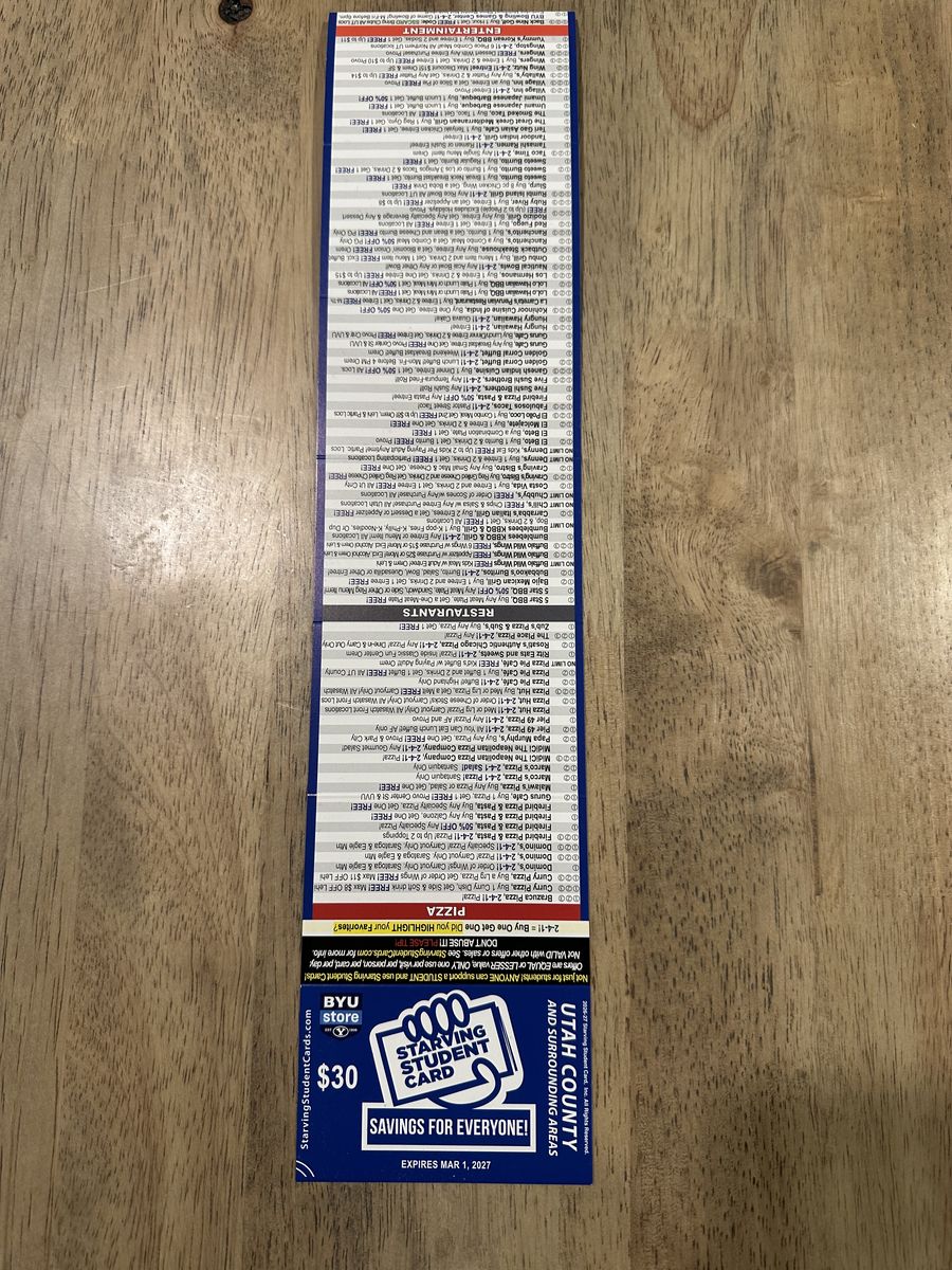 I have Starving Student Cards available! This card gives you tons of discounts at local restaurants, fast food spots, and other businesses. Perfect for students, families, or anyone who likes saving money.
