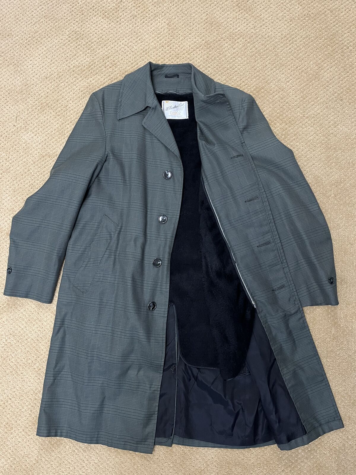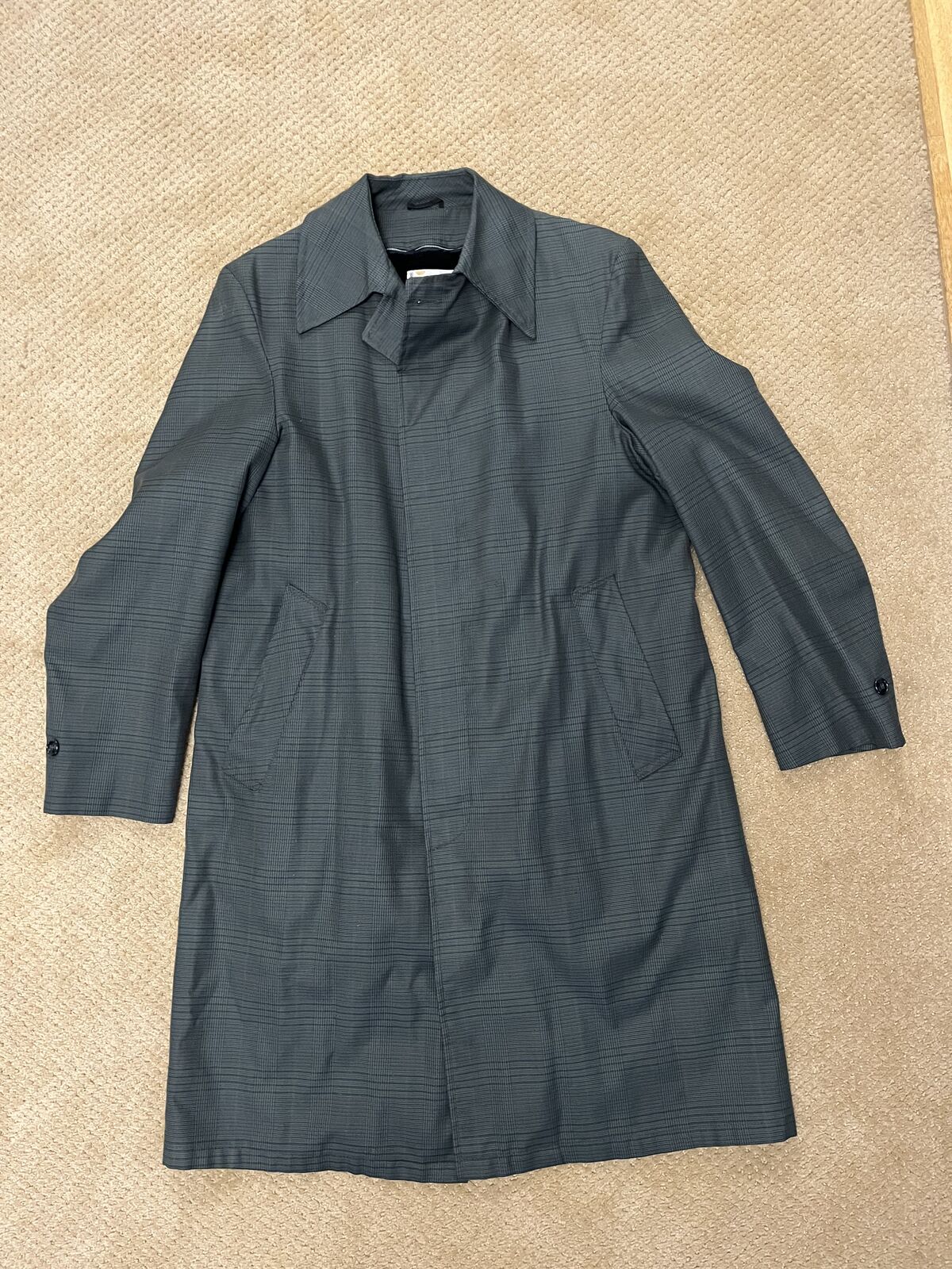 VenmoIt's cold and you are going to want this. It is a man's all weather coat size 38 [Medium]. It has a blue green background with small blue stripes and a little bit of a plaid look. Some of the pictures look like a olive green, but it is not olive green. This has a zip out liner that looks like a fur. The front has hidden buttons. It is 41 inches long. It has 2 outside pockets. It is a water repellent. It is a very well made vintage jacket. This is in excellent condition in a smoke free home. Price is firm.