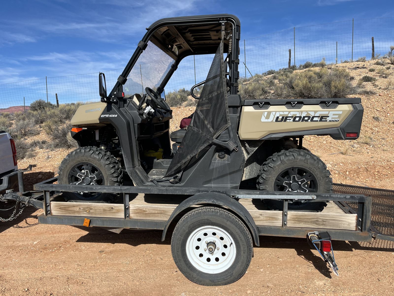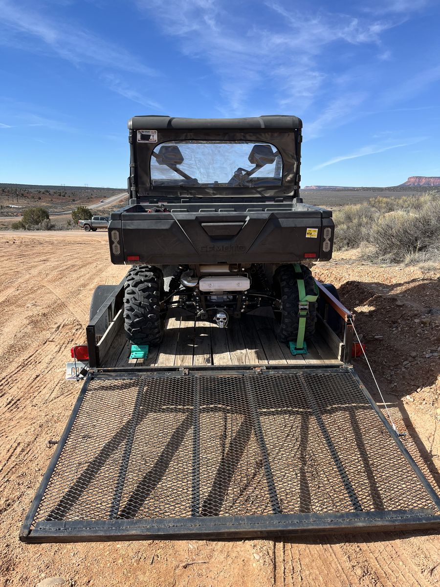 Zelle2024 CF Moto Uforce 1000 plus utility trailer with ramp. Has about 880 miles. Asking $13,500 total for both. Trailer has new tires and wheel bearings. Side by side has front windshield and rear zip down window. Cash or Zelle. Located in Greenhaven (between Page and Kanab).