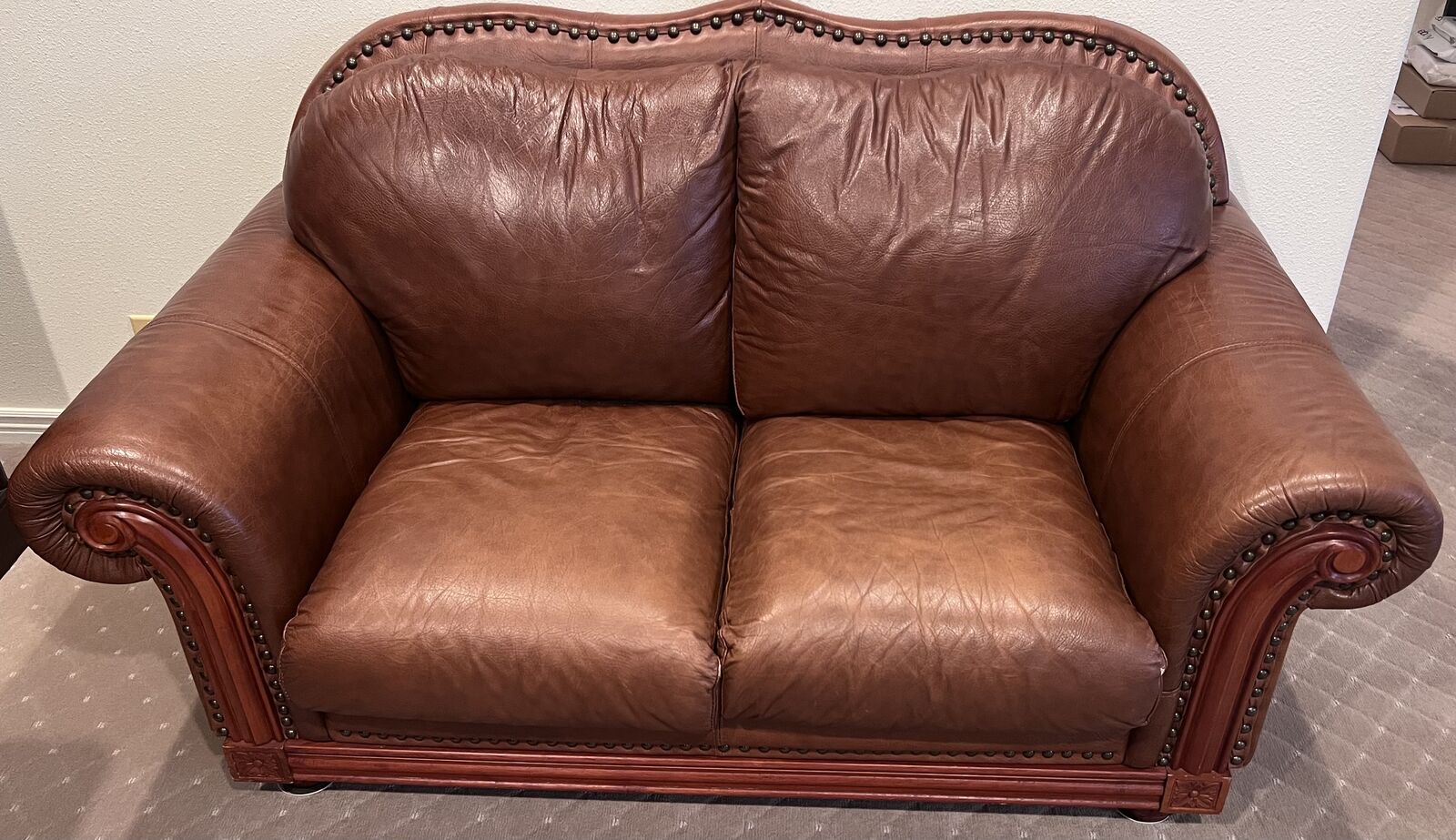 VenmoLuxurious comfortable seating for seven in beautiful leather with nail head trim. Come and see these for yourself and try them out! Sides and back of each piece are pleather match that look identical. Removable cushions and backrest for easy cleaning. You won’t find a nicer set! Cash or Venmo only.