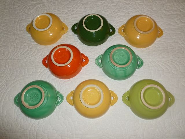 VenmoFiestaware is loved, collected and highly sot after. This is an amazing collection of cream soup bowls. Most of these colors were made from 1936-1959. The company started making Fiesta in the 1930's, America was just coming out of the great depression. The company made bright fun, cheerful colors to bring joy to people's lives. They also sold thier pieces one at a time. That way you could buy the colors you wanted and the items you needed and wanted, one at a time. Not having to buy a whole set of dishes was a great benefit to people. The dark forest green and the chartreuse [lime colored one], are the only ones made in the 1950's. The other colors were made earlier than that. From handle to handle they are 6 1/2 across x 2 1/4 tall. Inside the bowl is 5 1/16 across x 2 13/16 across the bottom. Everyone of the bowls is marked Fiesta. These are in very good condition. The only exception is the chartreuse bowl has a small chip on the base. There are a few utensil marks and a little wear on the rim of a few. But they are bright and shiny and the glaze is great. These are getting harder and harder to find, especially in a set. This was my mothers set. She starting collecting Fiesta in the early 1970's. This is a wonderful assortment of colors. Only sold as a set. I will not ship these. No trades. Selling for a parent so the price is firm.