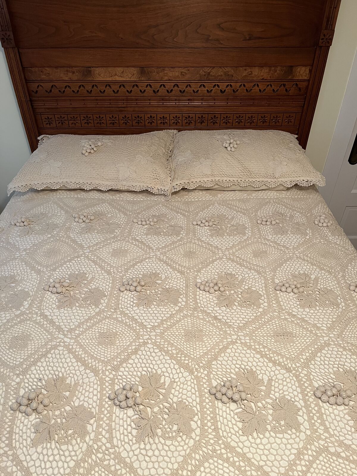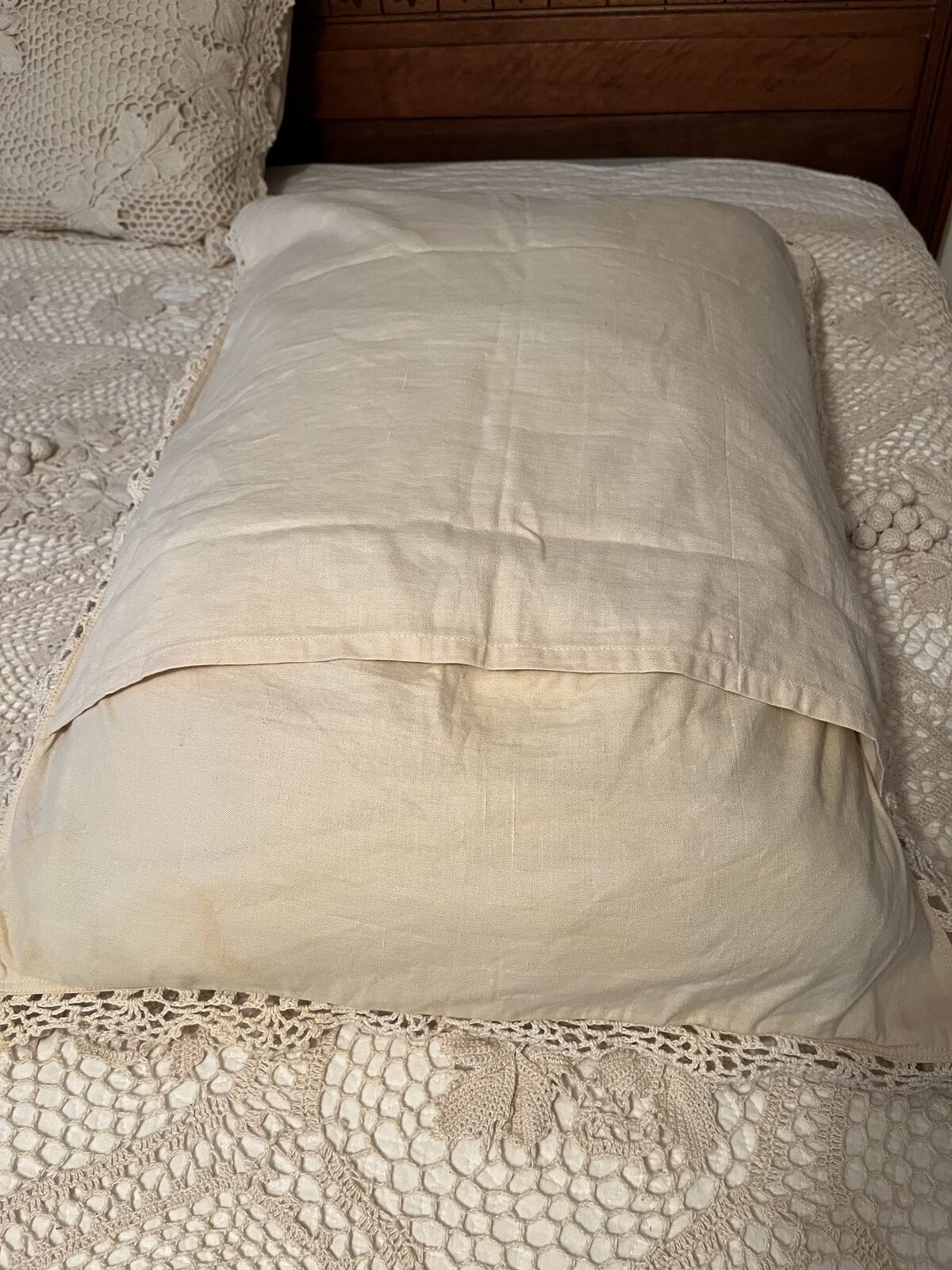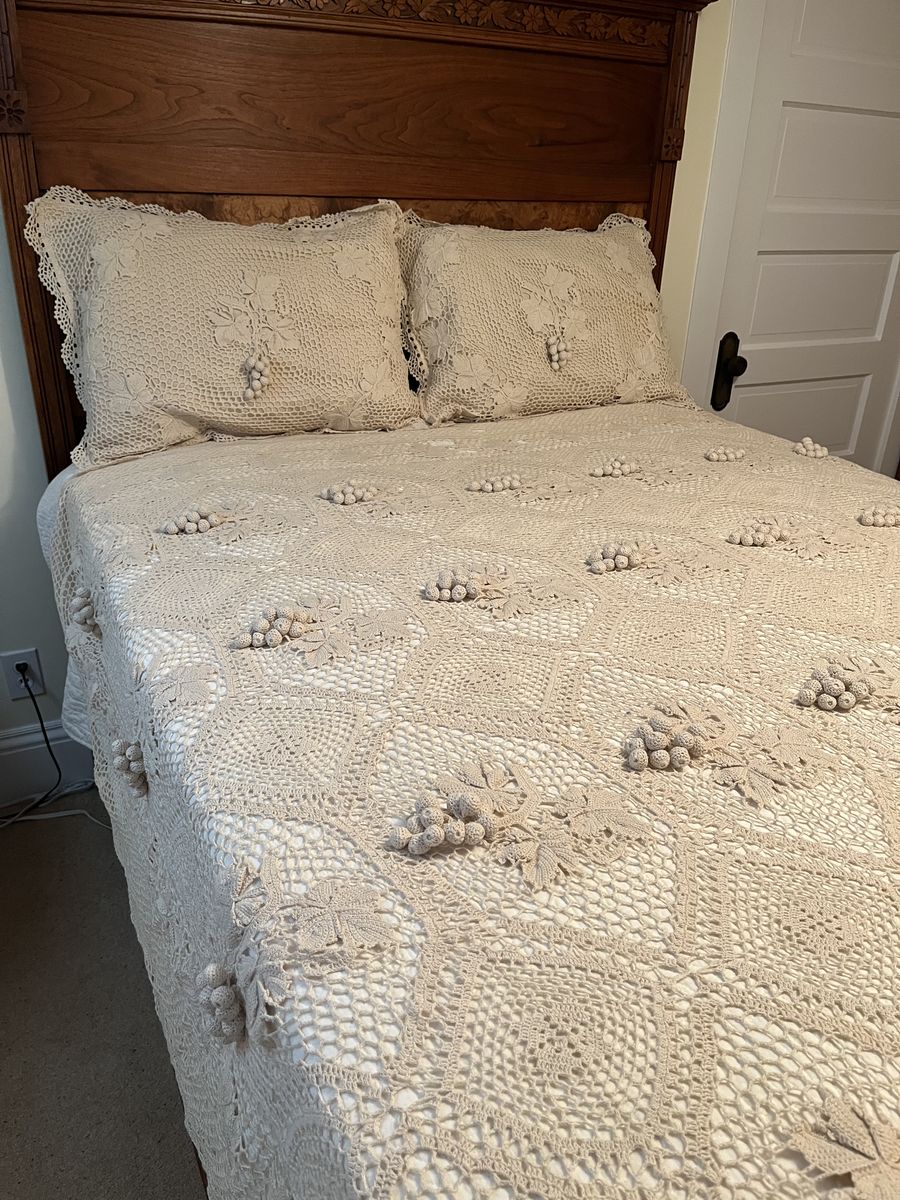 VenmoI layed this bedspread out on my queen size bed to show all the beautiful detail it has. It is an off white, ecru color. Pillow cases measure 23 inches x 28 inches. This bedspread is 82 inches x 84 inches. It is 55 % Linen and 45 % cotton. Everything is in excellent condition except one pillow sham on the Back. I found a small stain and a small tear mark. As shown in the photos. This set is vintage. It was made to look antique. I have included a picture of the tag. A very pretty must see set. The bed frame is not for sale. Price is firm.