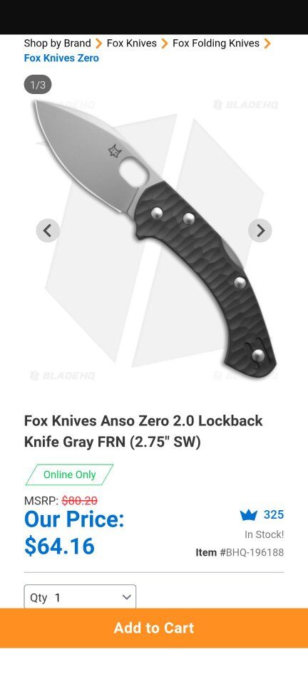VenmoNew in open box Fox Anzo Zero 2. Made in Italy. Stonewashed blade in BECUT steel to many knives. Letting this one go at 40% off. Blade HQ original price at 80.20 and on sale at 64.16. I'm letting it go for 48.00