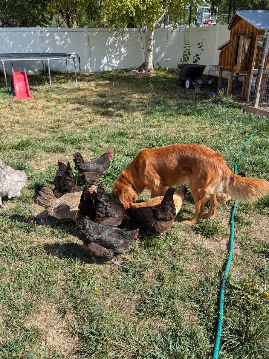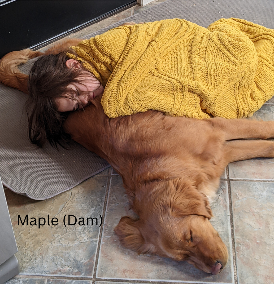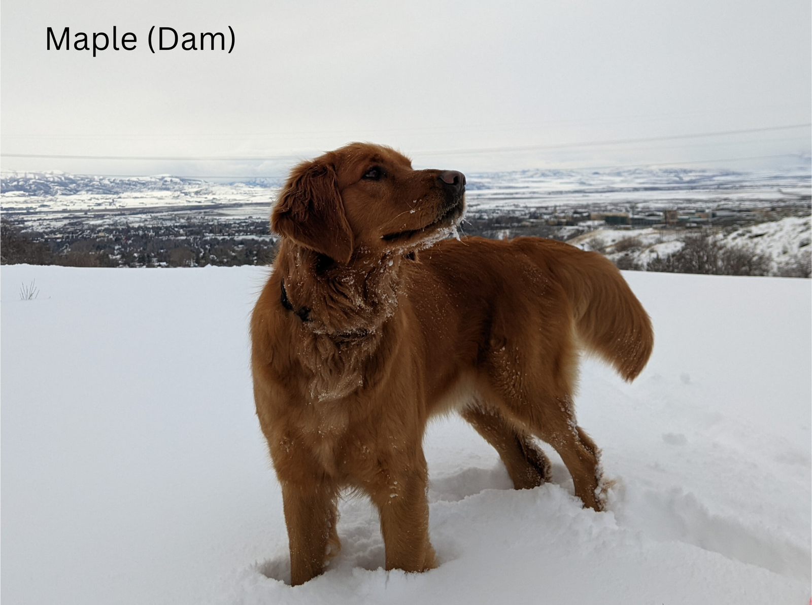 Maple (Dam) 65-68 lbs with a soft dark red coat .She is very sweet, sensitive to our family’s feelings, loves kids, calm, obedient, quiet, friendly, and a loving, loyal companion. She loves the outdoors, playing fetch, swimming, and stays right with us when hiking.