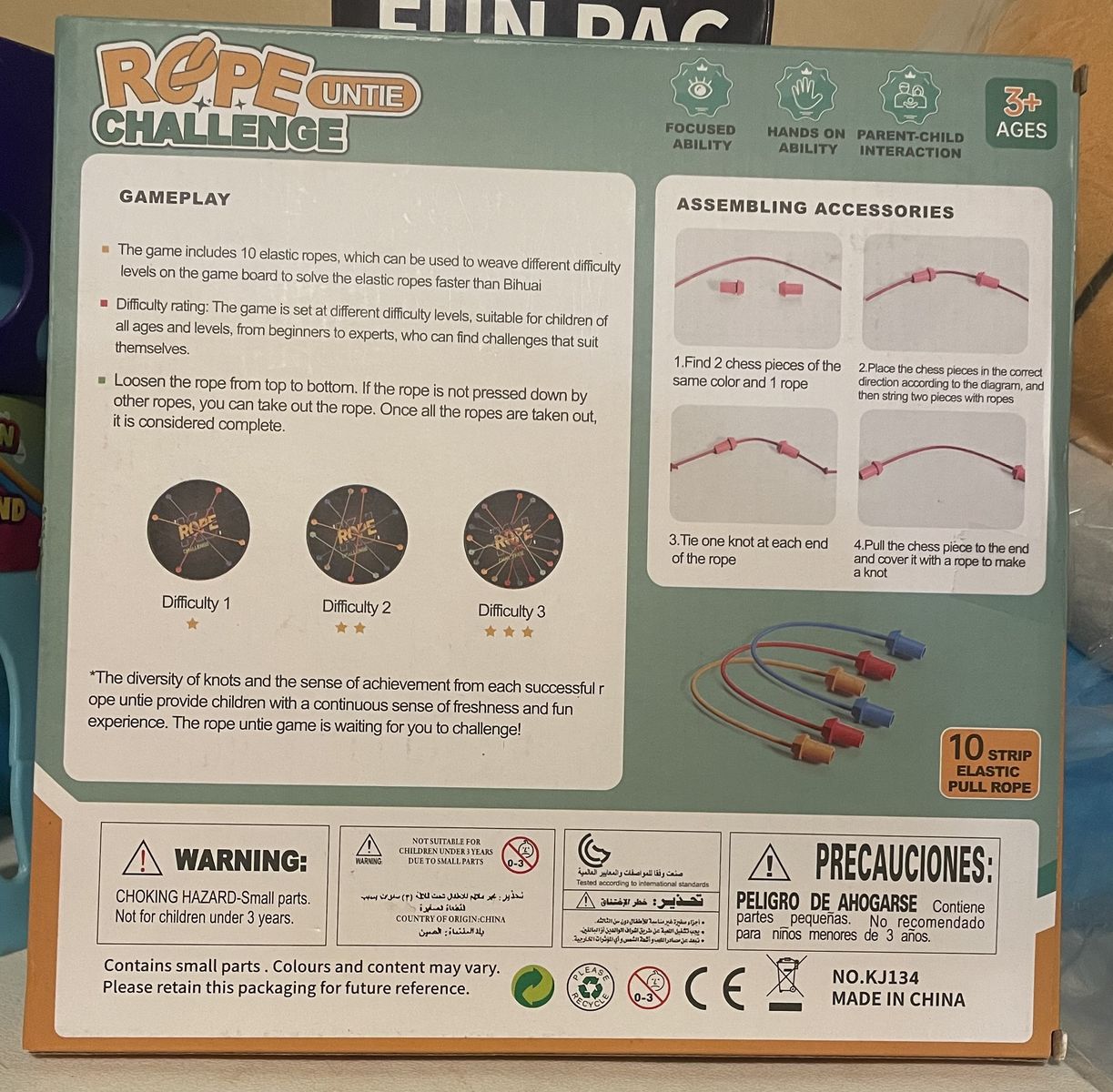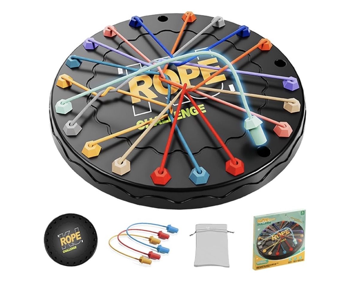 VenmoRope Challenge Board Game by Lartoys, a tabletop puzzle game designed for ages 3 and up. • Gameplay: Players weave colorful ropes through various difficulty levels on a game board and then try to untie them to complete the challenge. • Features: It is designed to improve logical thinking, spatial awareness, and hand-eye coordination. • Suitability: The game is suited for parent-child interaction and encourages hands-on problem-solving.