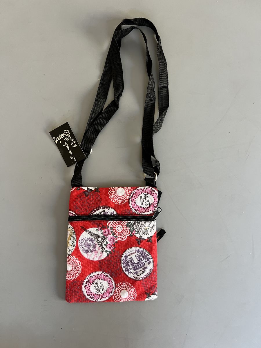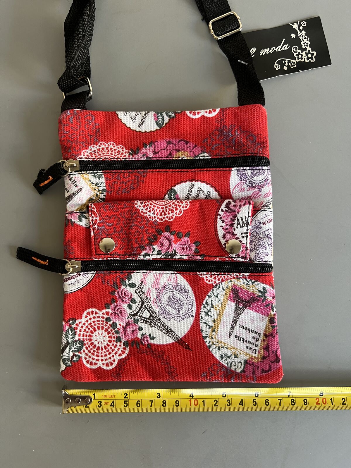 ZelleThis listing is for a 2 Moda canvas crossbody bag with several different zipper compartments and one snap compartment.
