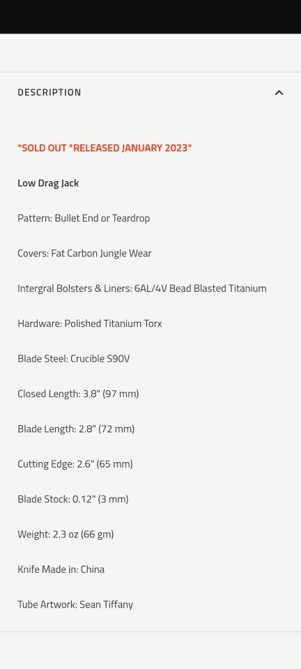 VenmoVery nice used condition Low Drag Jack with titanium and carbon jungle wear handle. Perfectly centered, snaps hard and clean. S90V steel, premium knife in great condition save for light scuffing from pocket carry. These were $300. Sold out and unavailable.