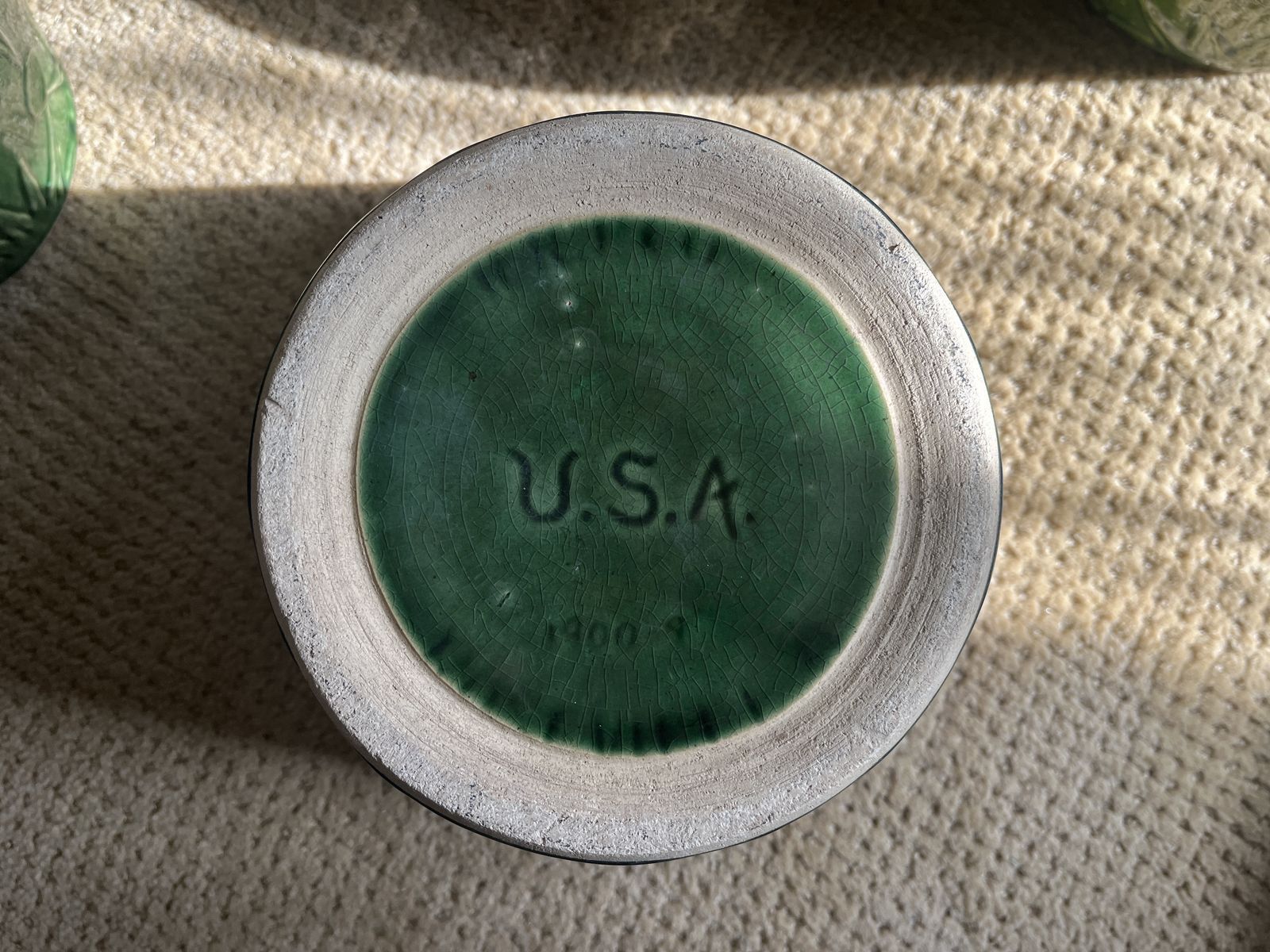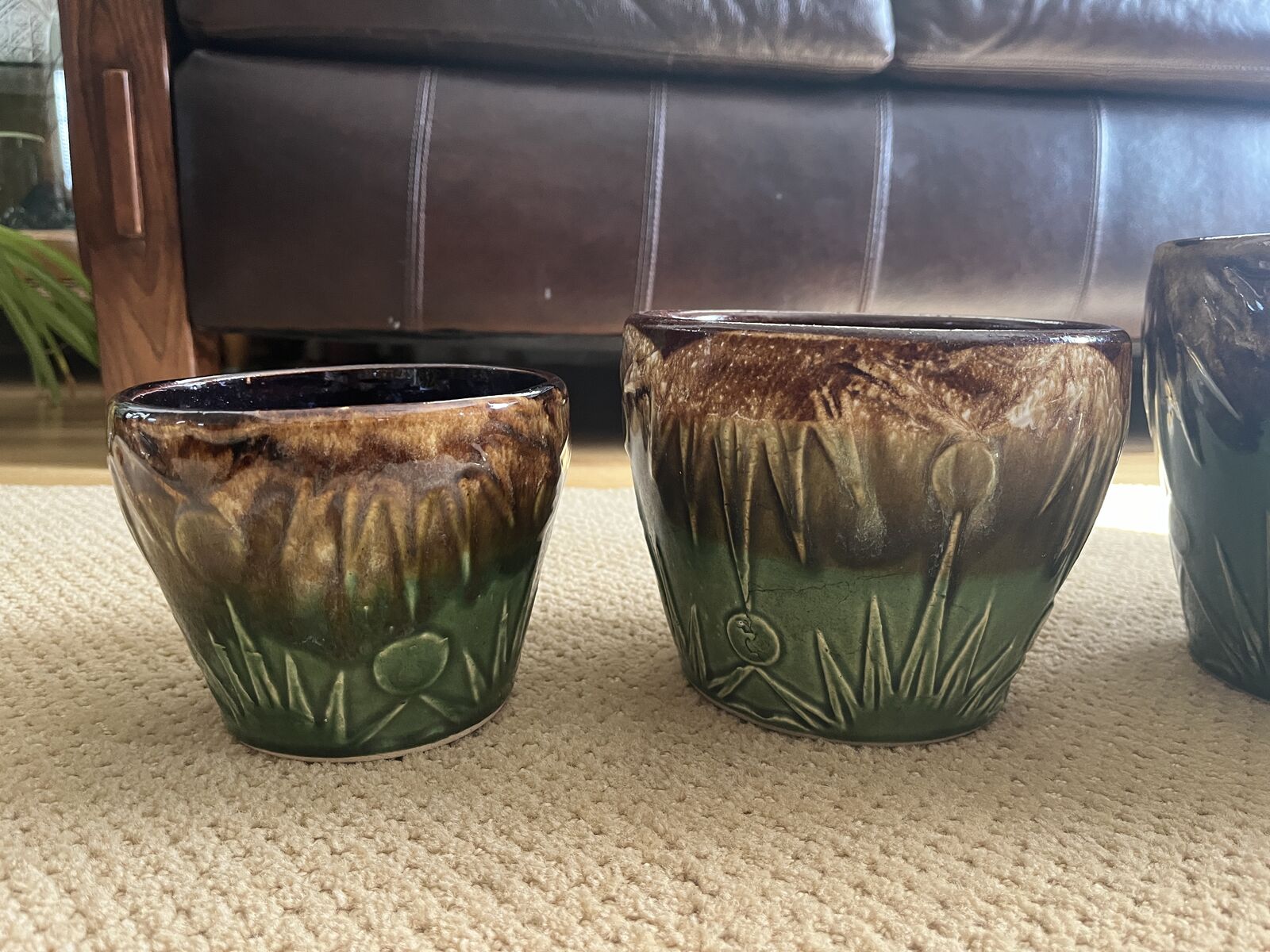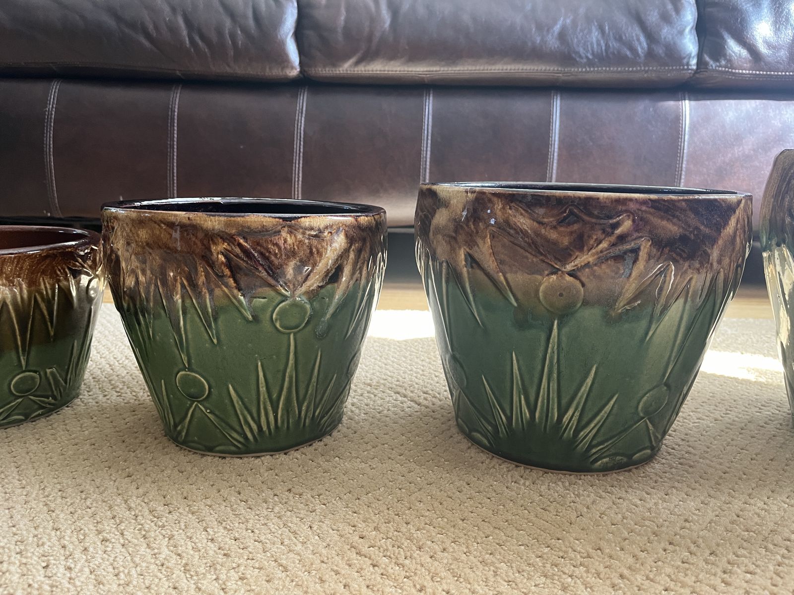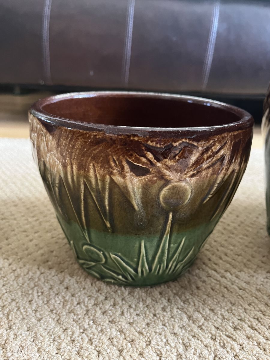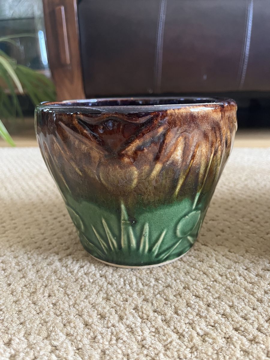 VenmoThis is a one-of-a-kind set. These are five gorgeous matching art deco style pottery in graduating sizes. This set was made by Robinson and Ransbottom, in the 1920’s. RRP Co Pottery History (Per the 'Old & Antique Pottery website): In 1900, Frank Ransbottom and his brother started a pottery company in Roseville, Ohio to make stoneware and pottery. By 1916 Ransbottom Pottery was the largest producer of stoneware jars in America. Around 1920, they merged with Robinson Clay Products Co. who created bricks and tiles. The name was changed to RRP Company (to reflect both initials) and product lines expanded to include gardenware, in addition to their art pottery and functional goods. This pattern is called the ‘Sun and Moon’ which features a unique and intricate drip pattern in a glossy brown and green color scheme. Which perfectly complements this beautiful pattern. My research shows they were made between the 1920’s-1940’s. These are made from high quality clay and are a true gem of the early 20th century art pottery. This set is in mint condition except the 2nd smallest pot has a small chip on the bottom only in the clay color, not on any of the colored part of the pot. These are perfect for displaying your favorite plants indoors or outdoors, or as a decorative accent piece. A real must have for a collector of unique and stunning pottery. Sold only as a set. Sizes are as follows, smallest to the largest. Price is firm. 6 inches across the top x 4 ¾ inches tall x 4 inches at the base, 7 inches across the top x 6 inches tall x 5 inches at the base, 8 ¼ inches across the top x 7 ¼ inches tall x 5 ¾ inches at the base, 9 ¼ inches across the top x 8 inches tall x 6 ¼ inches at the base ,and 10 ¼ inches across the top x 9 ¼ inches tall x 7 ¼ inches at the base. Must see. Selling for a parent.