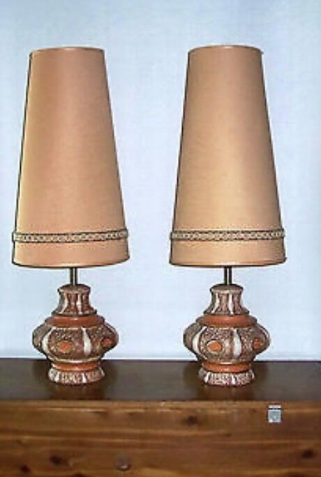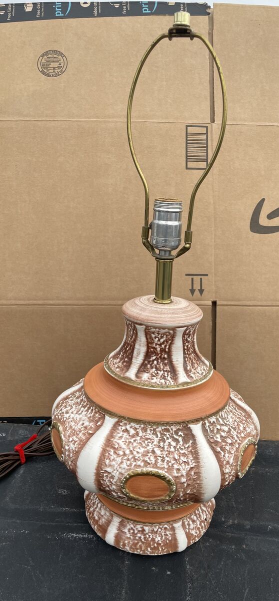 VenmoHOWARD KRON TEXAS POTTERY RETRO TABLE LAMP MID CENTURY ATOMIC MODERN. VTG 1950s HOWARD KRON POTTERY TABLE LAMP. THIS IS A RETRO MID CENTURY LAMP WITH A GREAT LOOK TO IT. IT IS BEIGE & ORANGE TERRACOTTA WITH WHITE SPLATTER. THIS FANTASTIC LAMP IS MARKED WITH TEXAS CERAMICS STUDIOS, BANGS TEXAS ON THE BOTTOM. THE LAMP. ALSO, MARKED KRON ON BACK BY THE BOTTOM. THE LAMP BASE IS 16 TO THE SOCKET, THE BASE WIDEST PART IS 10.