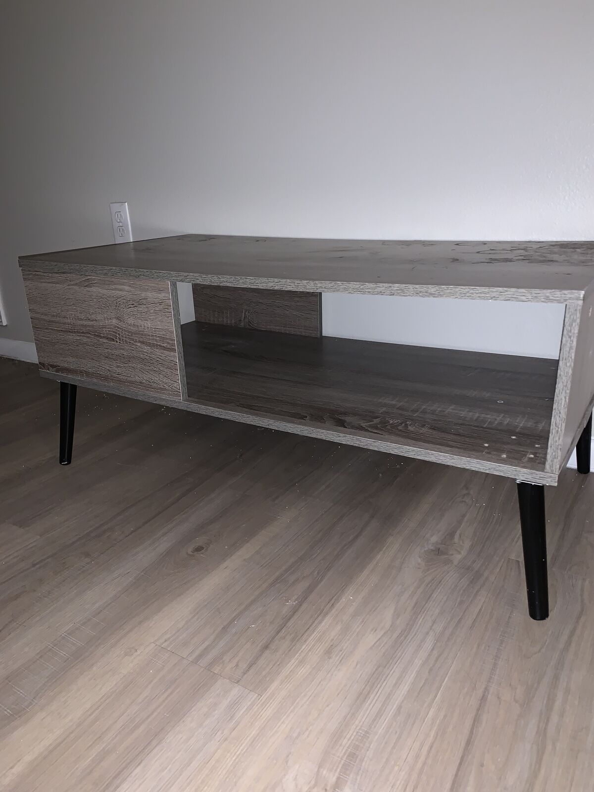ApplePayTV stand for sale. Wood finish with black legs. Has cabinet and open shelf storage.