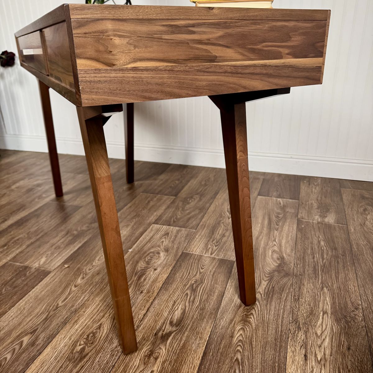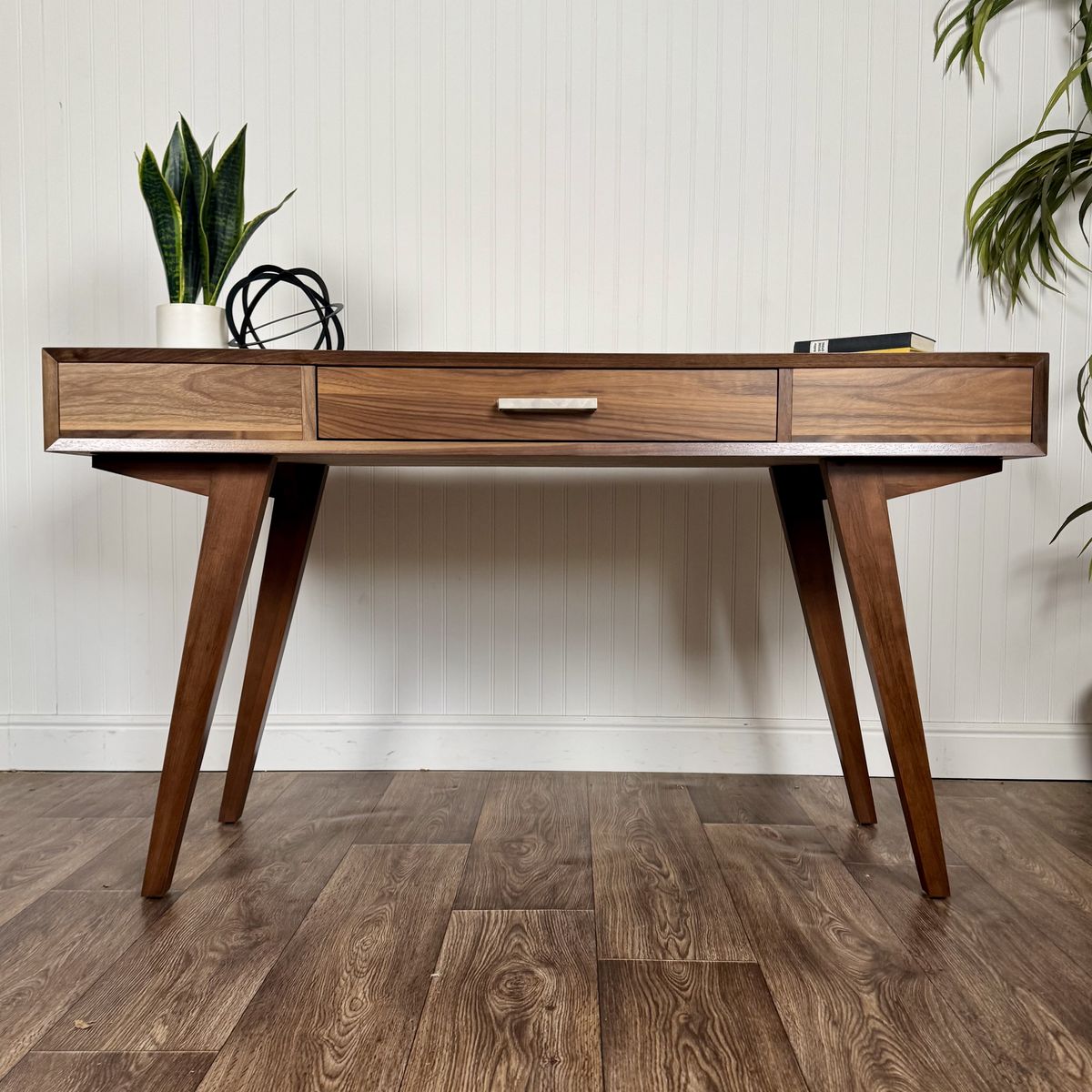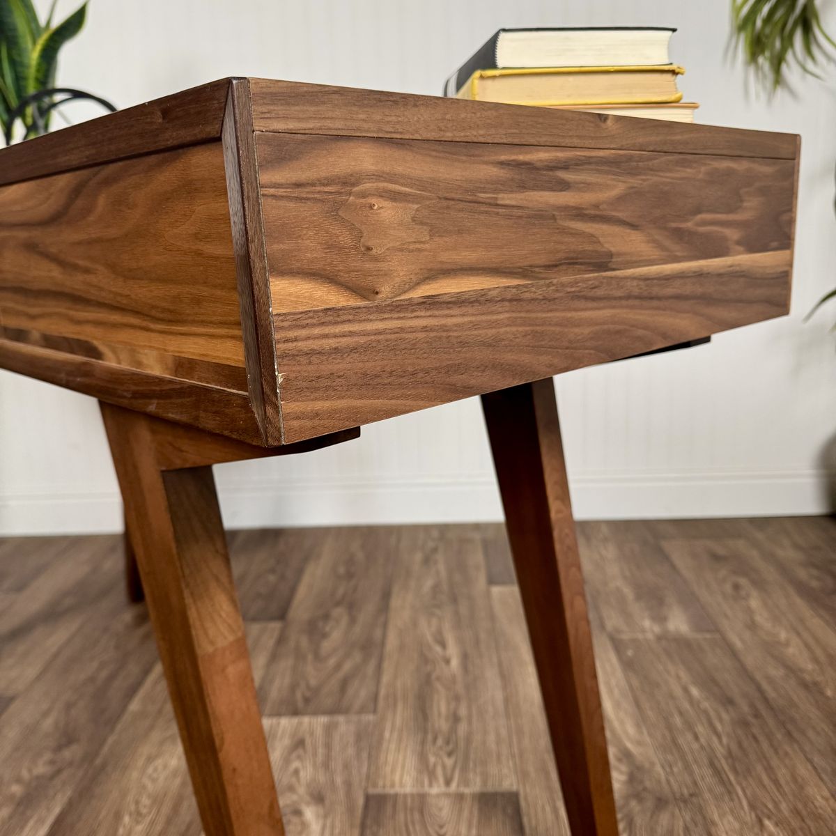 VenmoStunning mid-century modern–style writing desk. This piece perfectly balances 1960s vintage aesthetics with modern, high-quality construction. Features a central smooth-gliding drawer and splayed, tapered legs.