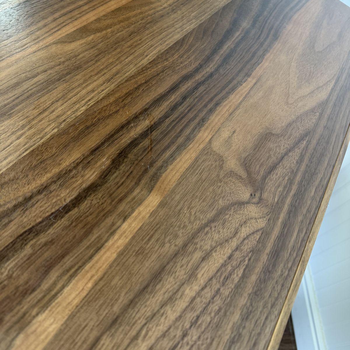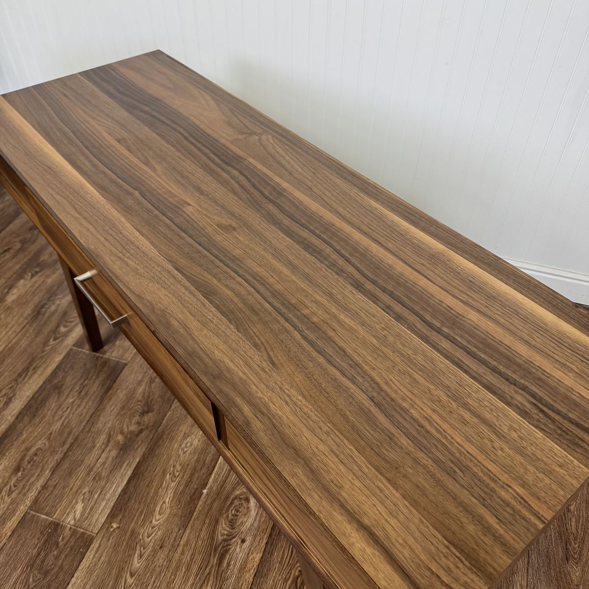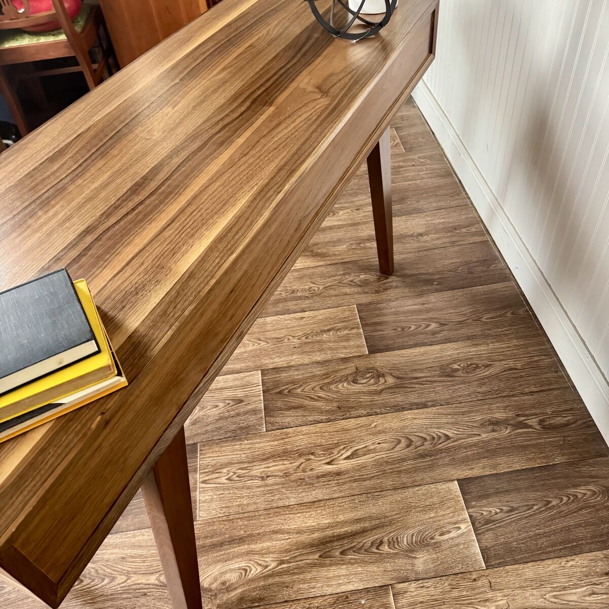 VenmoStunning mid-century modern–style writing desk. This piece perfectly balances 1960s vintage aesthetics with modern, high-quality construction. Features a central smooth-gliding drawer and splayed, tapered legs.
