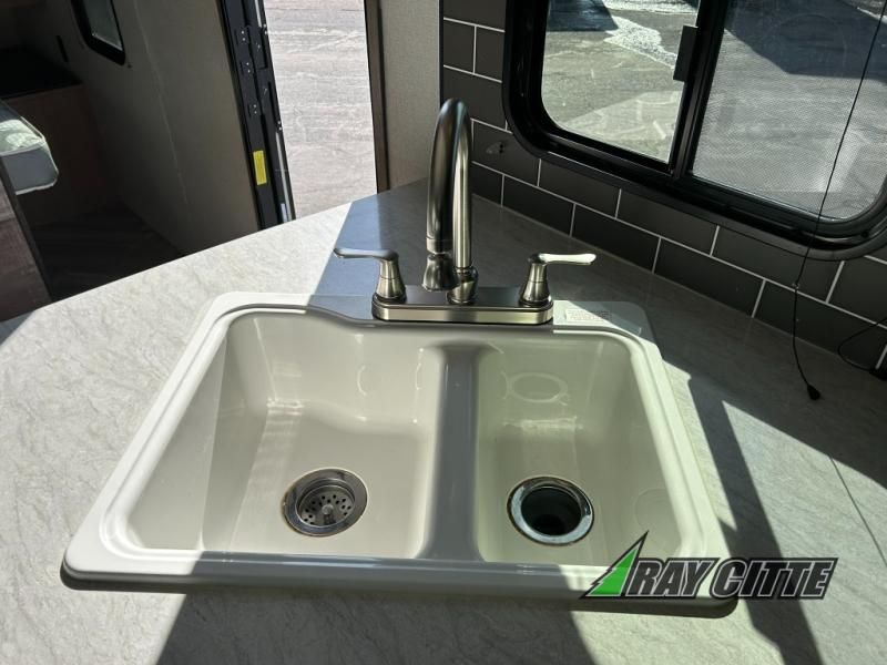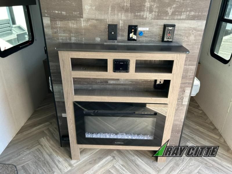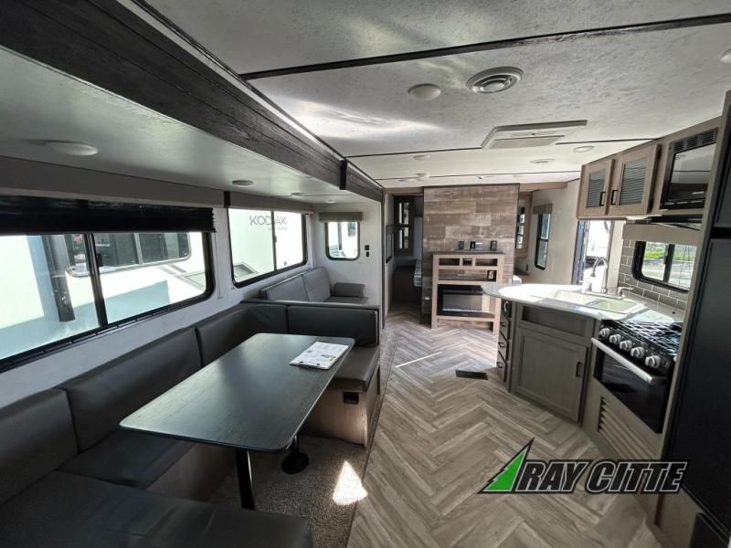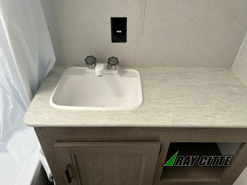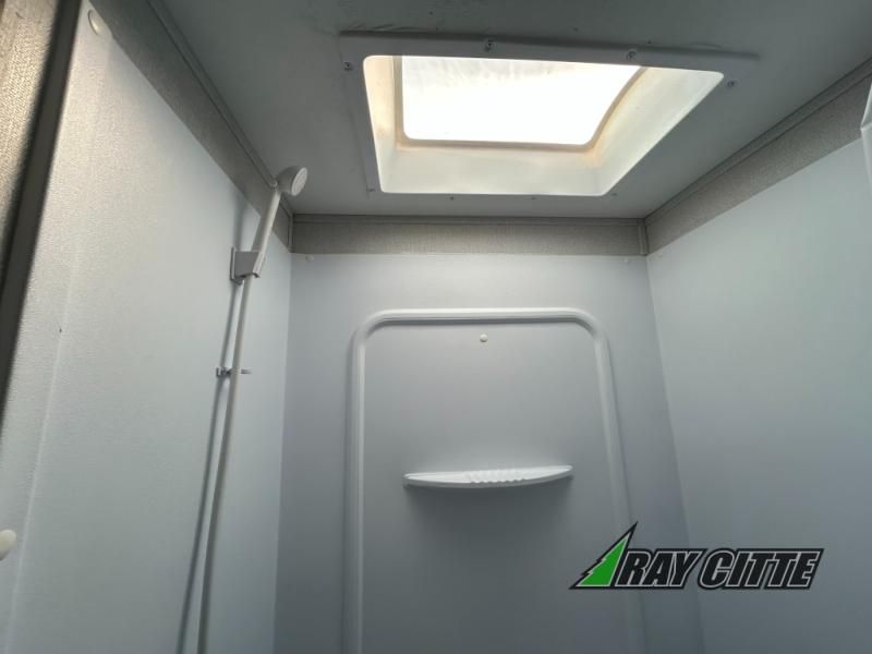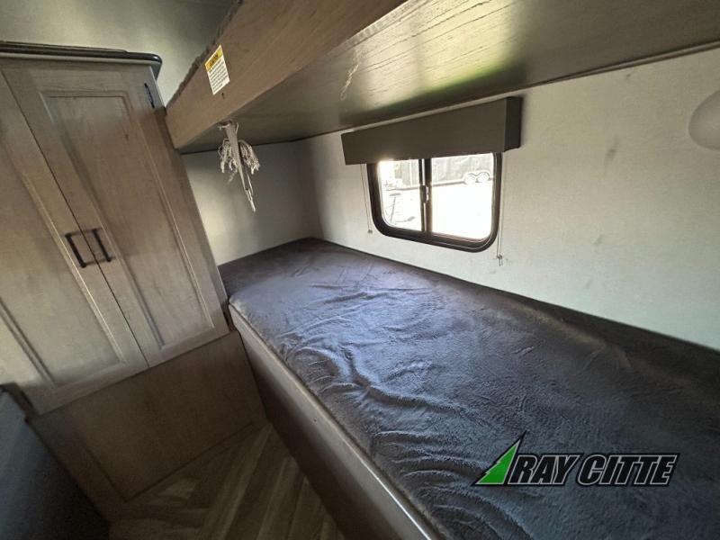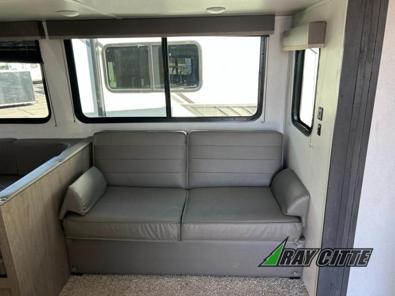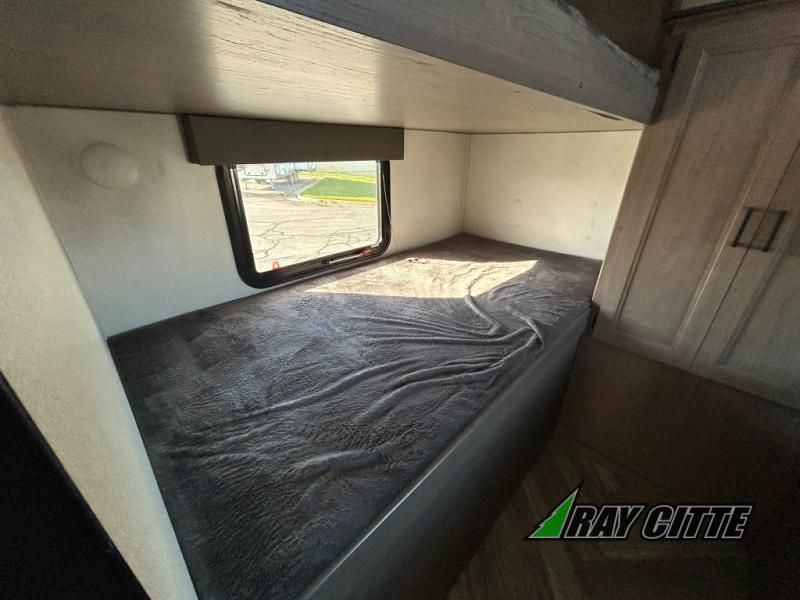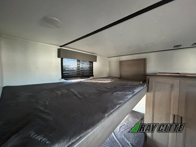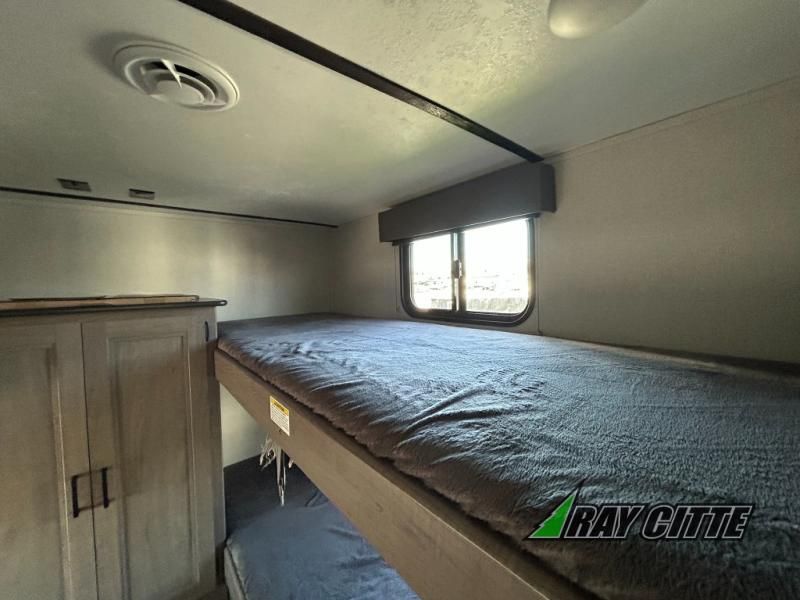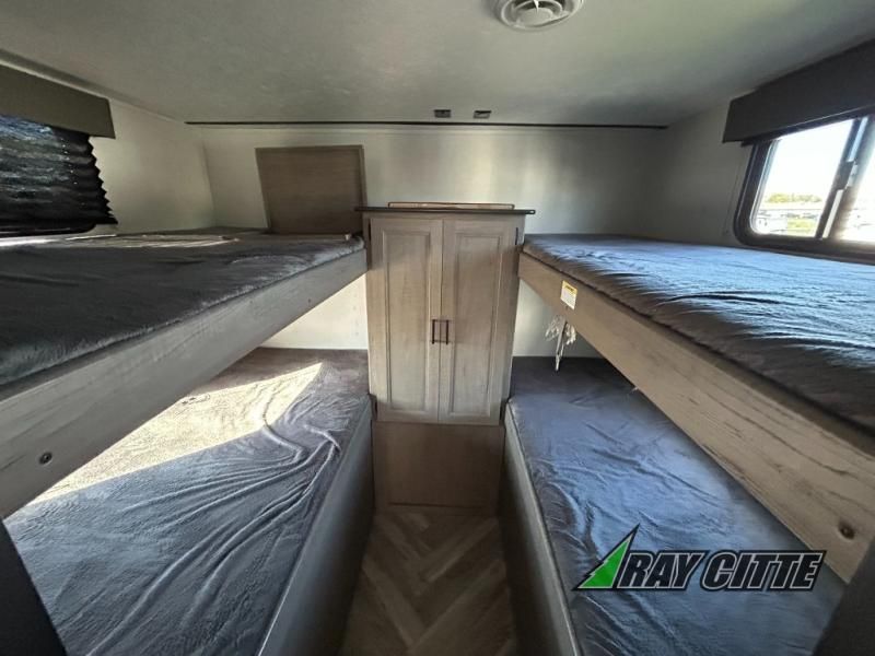 The kids will love camping in this Hideout travel trailer! They will have their own rear private bunkhouse with two sets of bunk beds, and you will enjoy your own front private bedroom with a queen bed that has a laundry chute on one side. The living area will have you feeling right at home with the jackknife sofa and the fireplace that has a place above it for you to add the optional 40" HDTV. A few other features you will love about this unit are the central vacuum, the U-shaped dinette, the large pantry, and the 38" walk-in shower!
