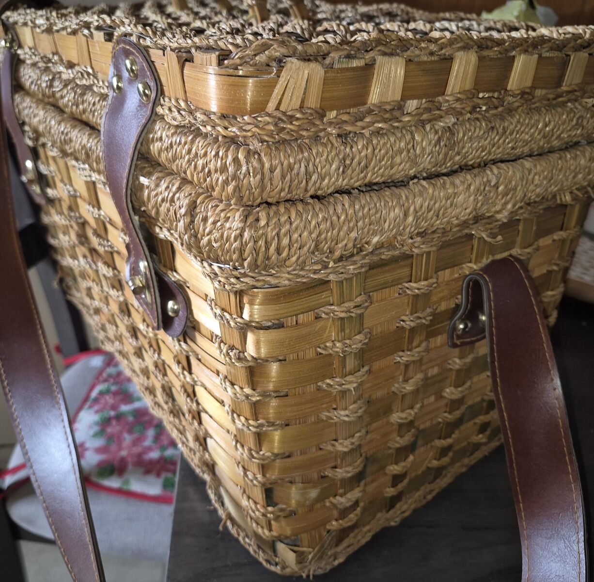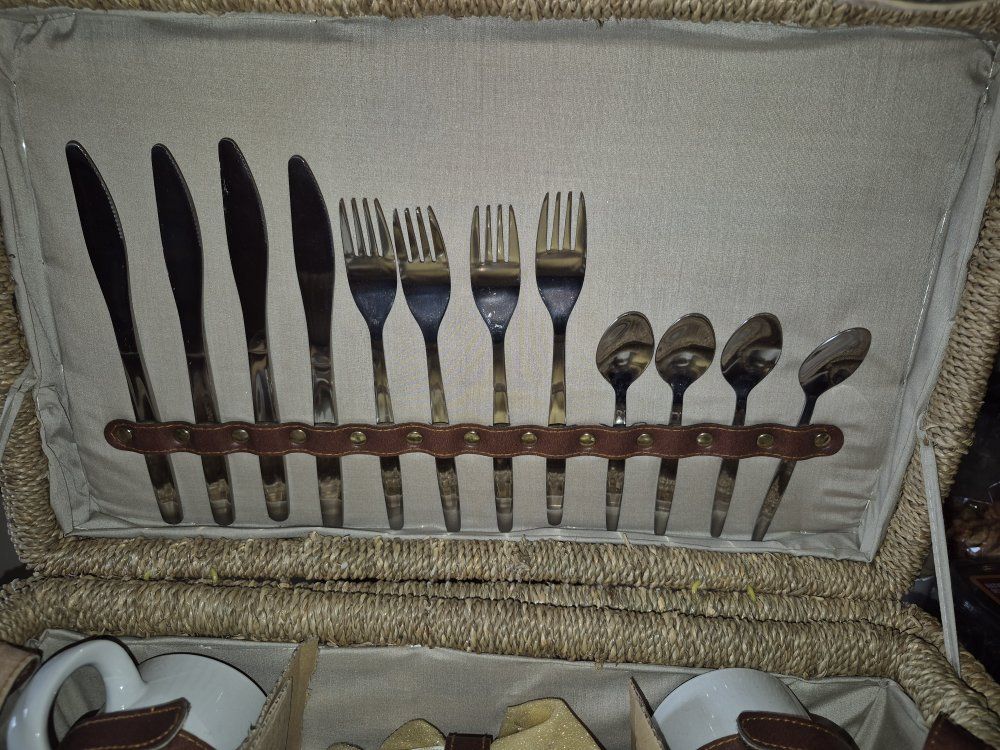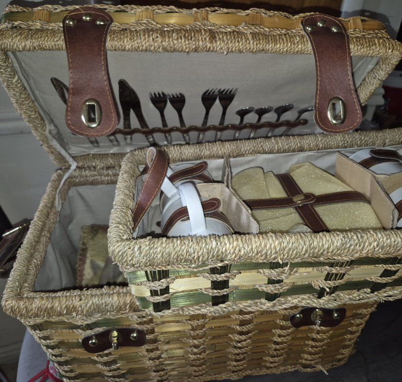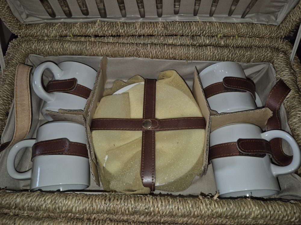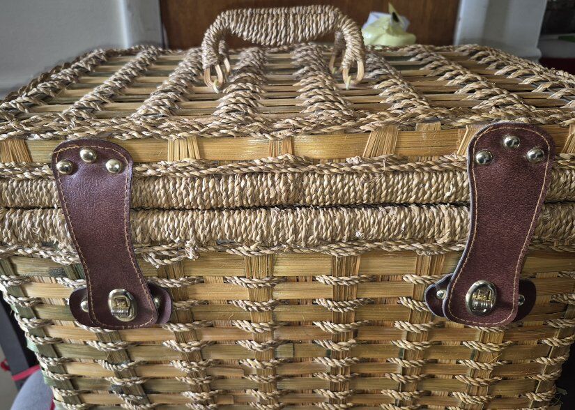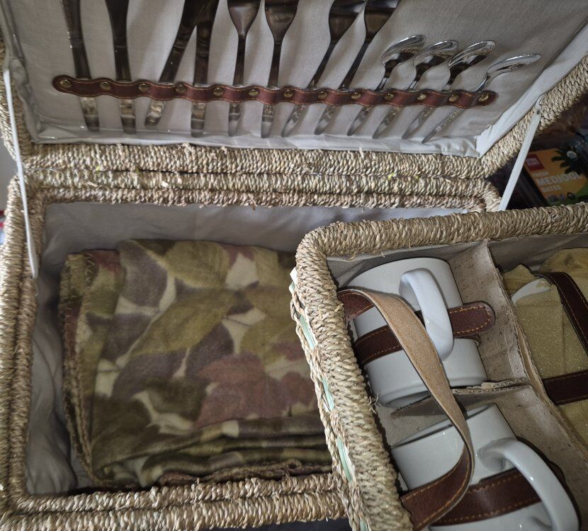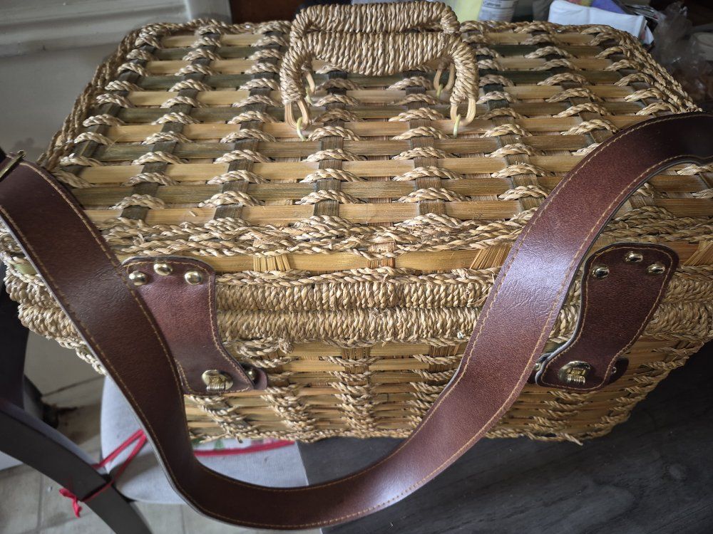 VenmoNew, never used. Original Vintage Set of four ceramic plates and cups Dragon Ocean dinnerware and flatware. Picnic blanket. Natural woven wicker rectangular basket with top handles, shoulder strap and turn-lock closures. 12x12x18 inches.