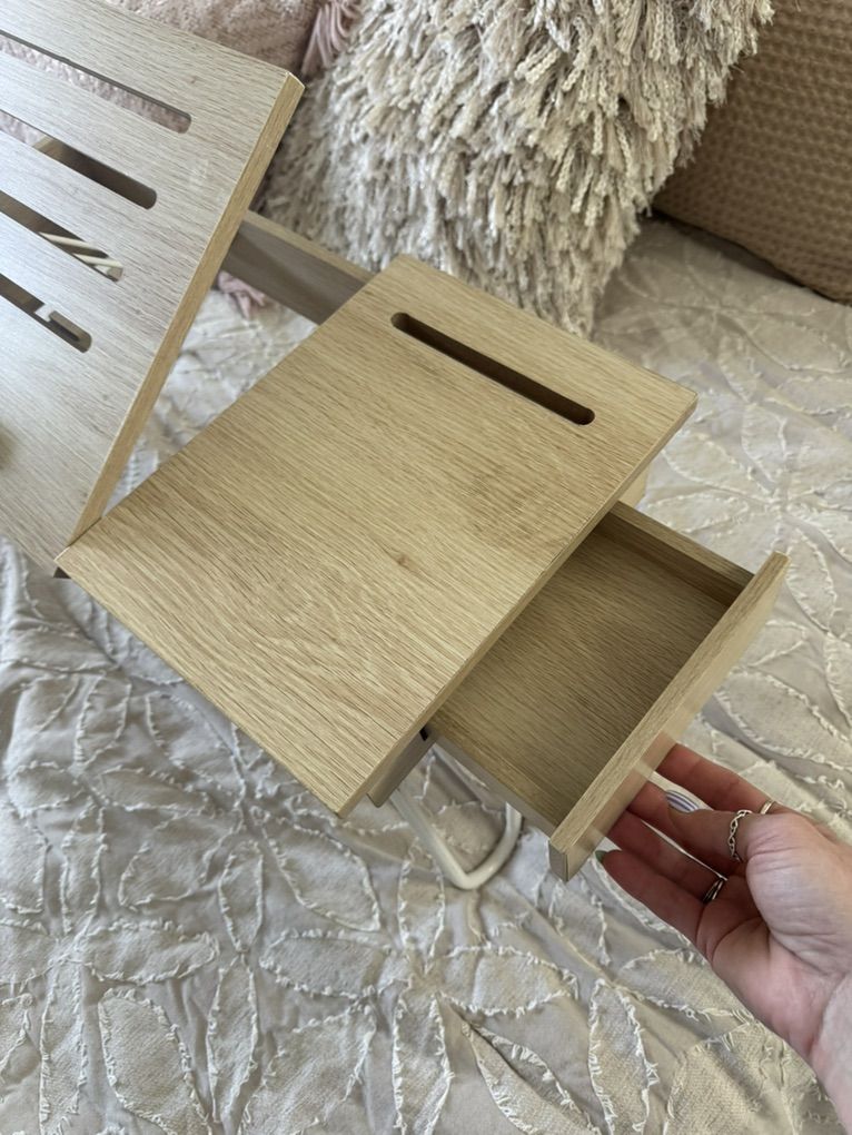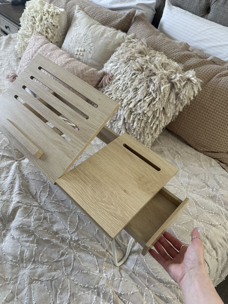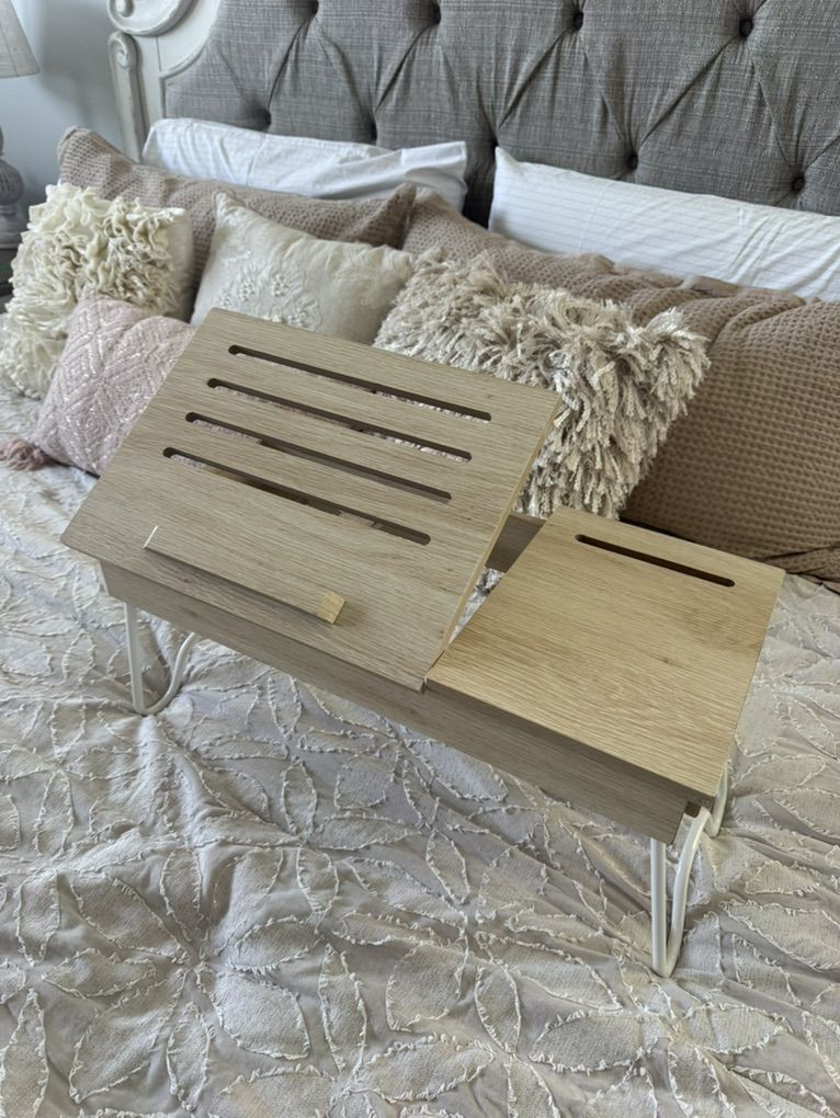ApplePayWood breakfast-in-bed tray with folding legs and built-in storage compartment.